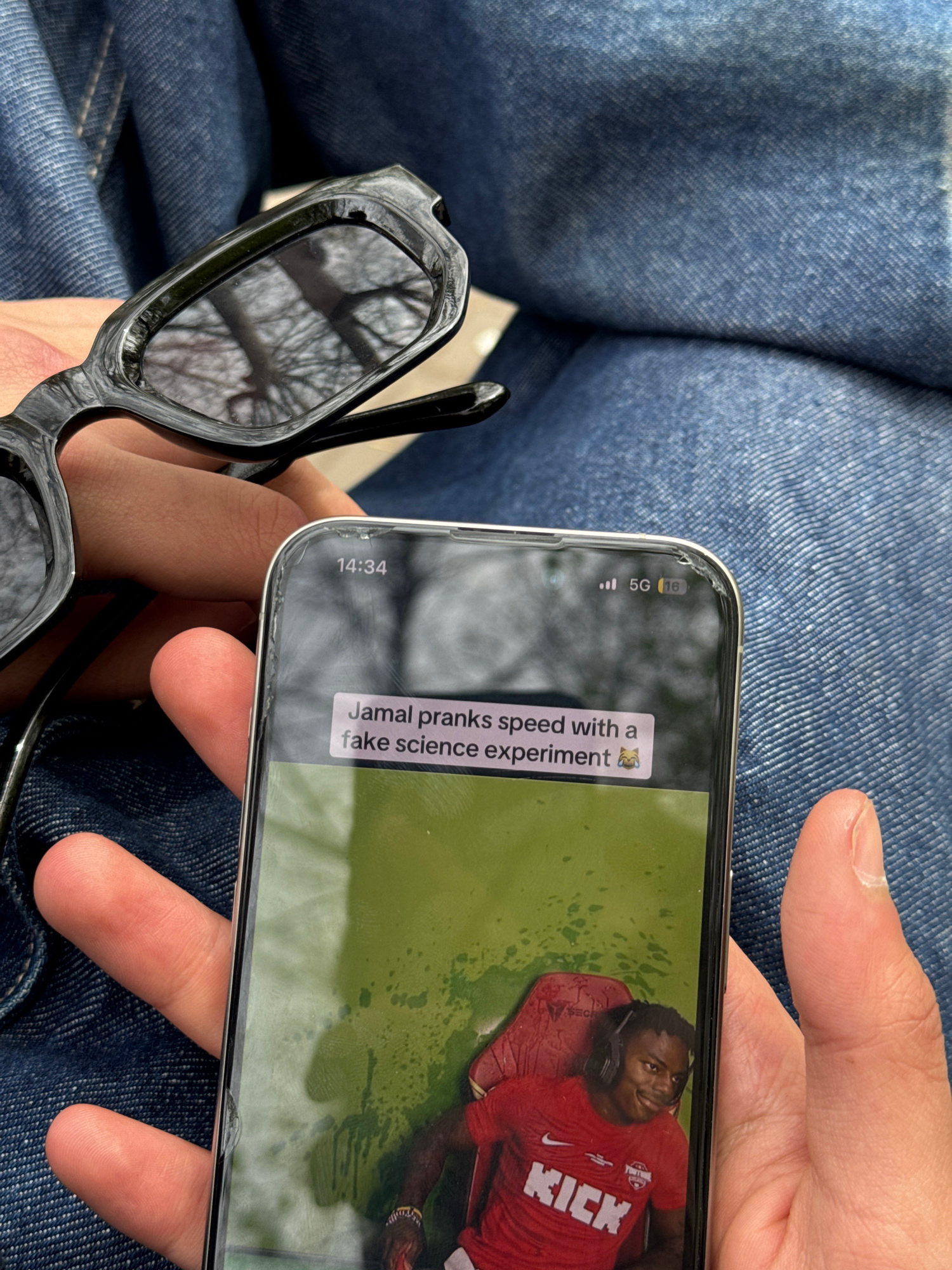 A person is holding a black iPhone with a cracked screen displaying a video of a person in a red shirt that reads “KICK” with the text “Jamal pranks speed with a fake science experiment.” The iPhone i…read more