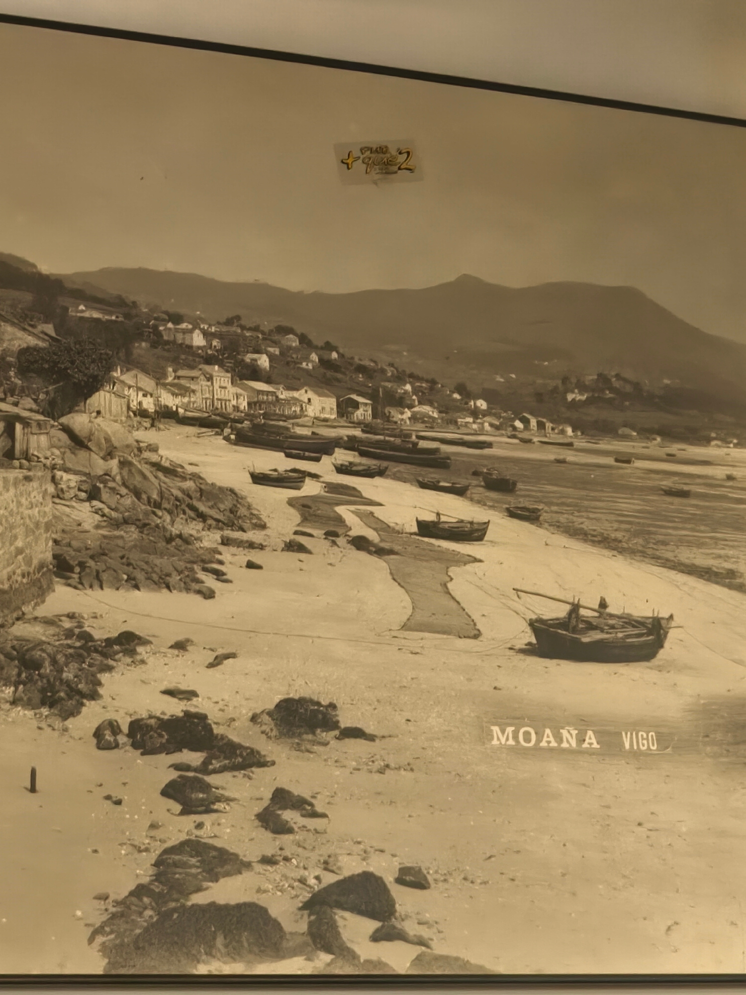 A vintage, sepia-toned photograph captures a tranquil coastal scene in Moaña, Spain. The image depicts a wide sandy beach at what appears to be low tide, revealing extensive stretches of wet sand and…read more