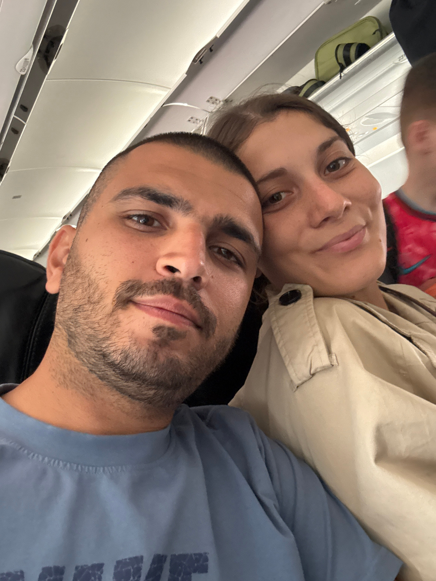 A selfie depicts a couple aboard an airplane. The man, with dark hair and a beard, is wearing a blue t-shirt. Beside him, a woman with fair skin and brown hair is wearing a beige jacket. The interior…read more