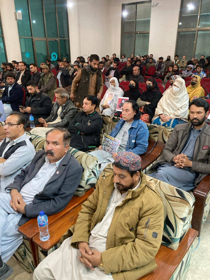 The image depicts an indoor gathering of approximately 60 to 70 individuals, predominantly adult males, within a large hall in Quetta City Tehsil, Pakistan. Attendees are seated in rows on upholstered…read more