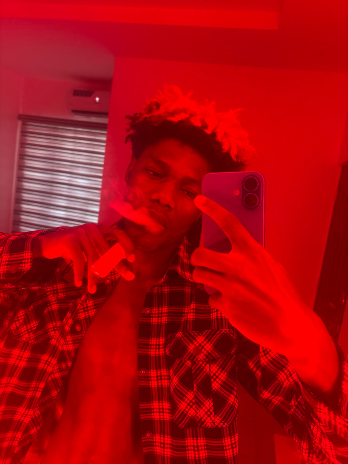 This portrait-oriented image, heavily saturated with a red filter, depicts a single male individual indoors in Igboefon, Nigeria, appearing to take a mirror selfie. The subject, a dark-skinned male wi…read more