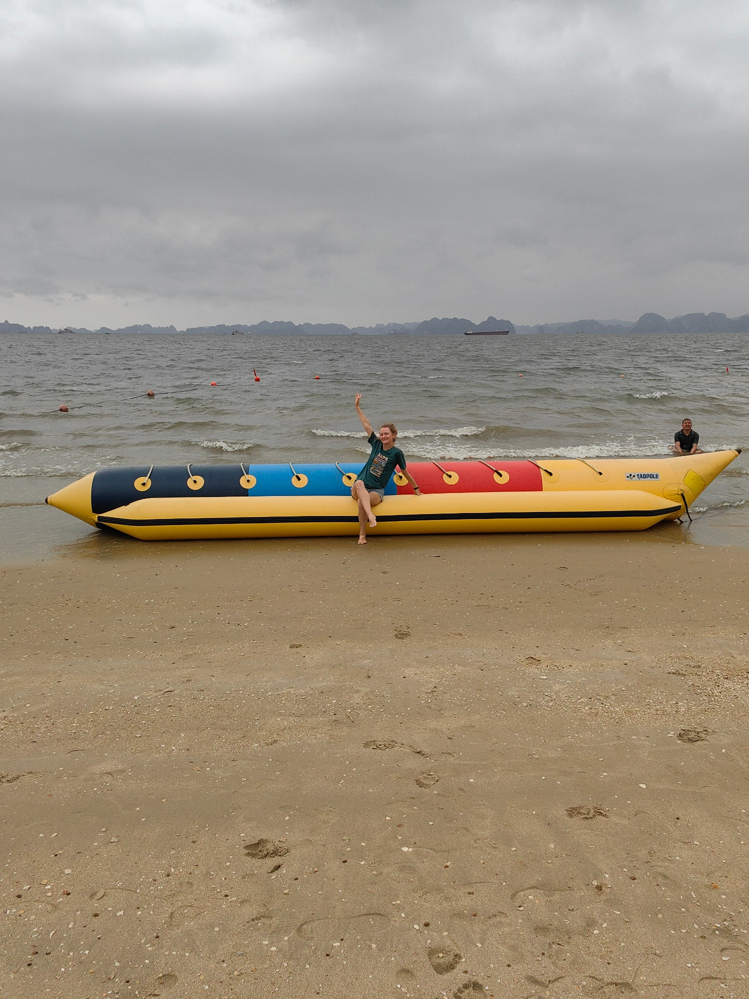 A beach in Bai Chay Ward, Vietnam on an overcast day shows a large inflatable banana boat resting on the sand with the bow partially in the water. A woman in a dark shirt and shorts sits on the banana…read more