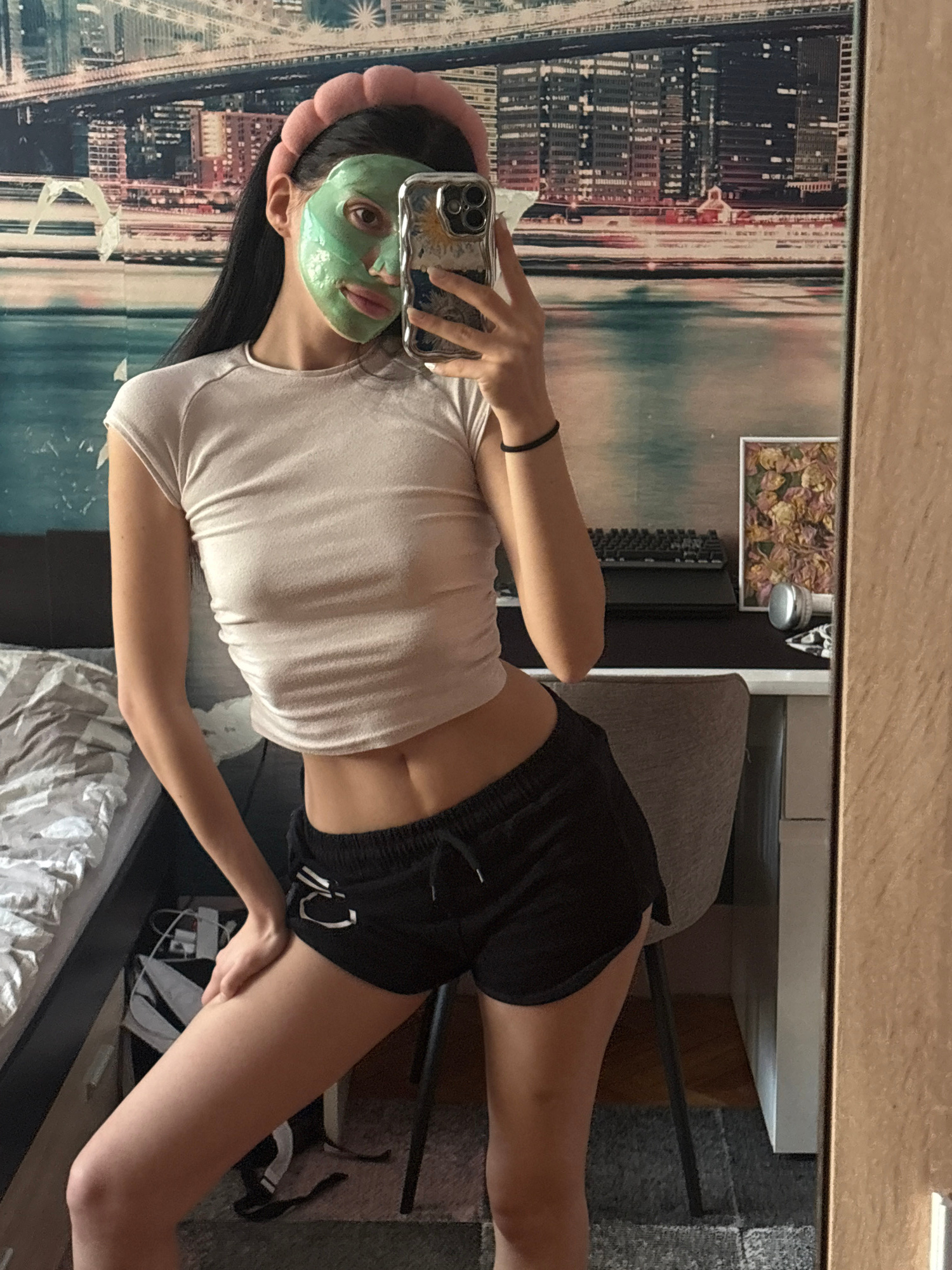 A person with a green face mask is taking a selfie in a mirror. The person is wearing a pink headband, a white short-sleeved shirt, and black shorts. The background includes a city skyline mural, a pi…read more