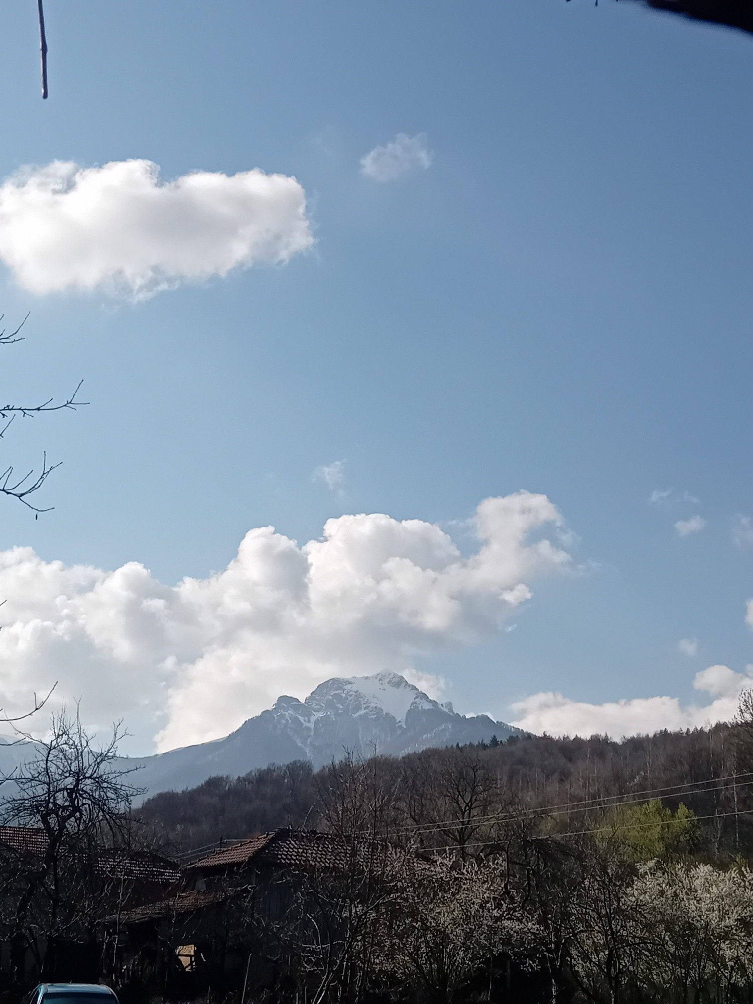 The image shows a sky with scattered white clouds, suggesting fair weather. In the background, there's a mountain range with some snow visible on the peaks. The foothills are covered with trees, some…read more