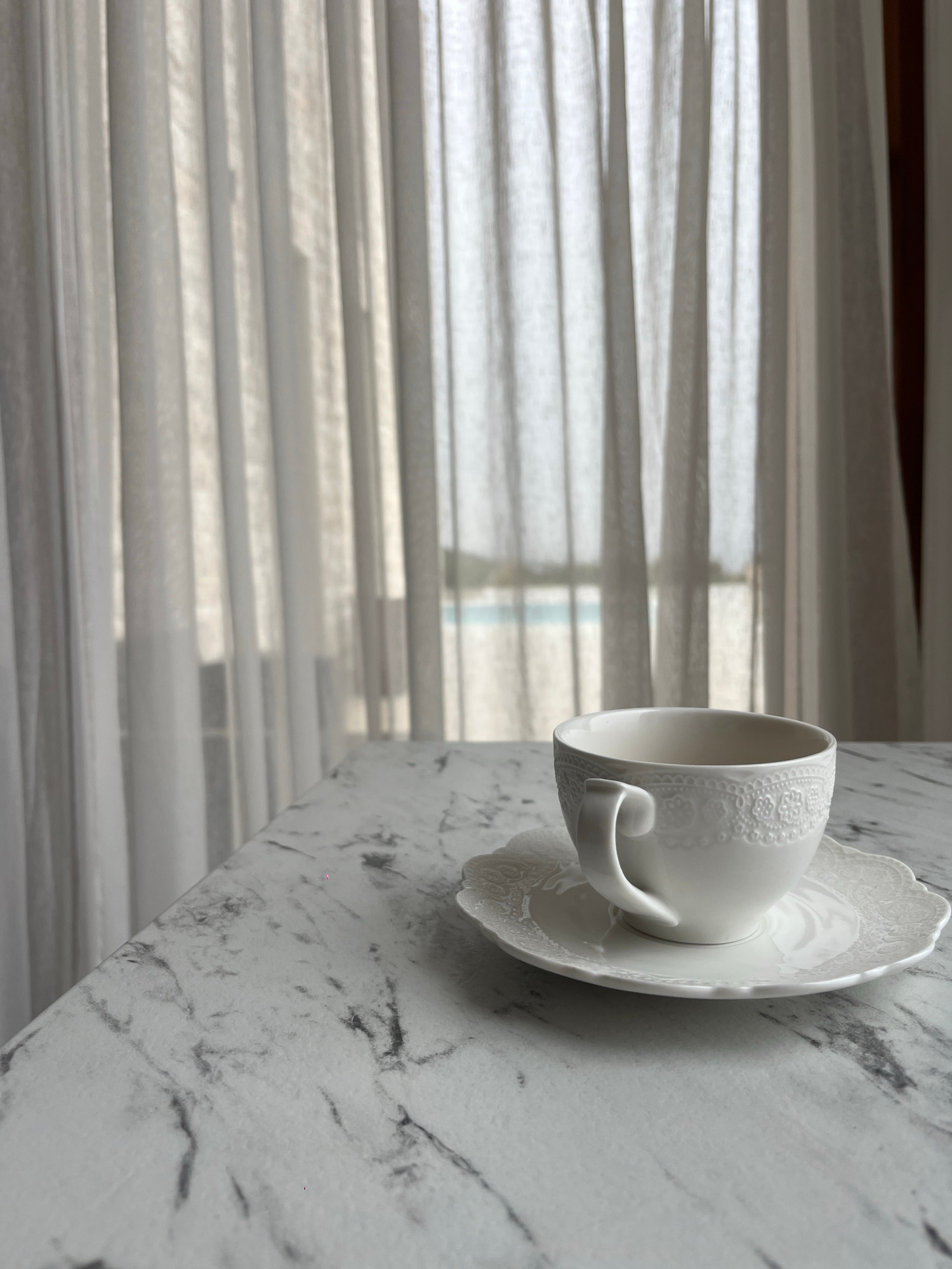A white teacup and saucer are positioned on a white marble surface. The cup is predominantly white with a decorative pattern. Behind the cup and saucer, a window with translucent, pleated blinds allow…read more