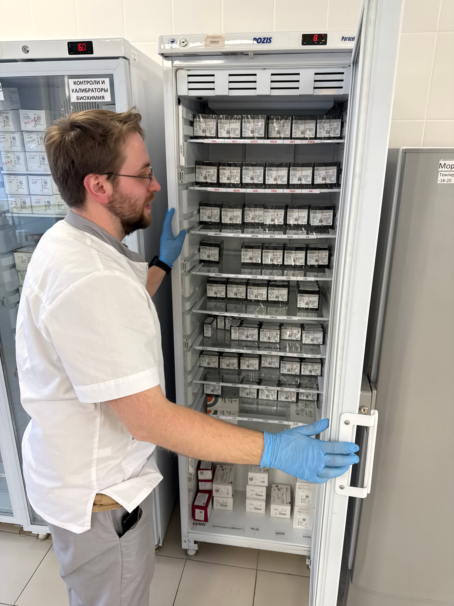 A man with a beard and glasses, wearing a white lab coat over a grey shirt and blue protective gloves, is reaching into a large, white laboratory refrigerator. He is holding the top handle with his ri…read more
