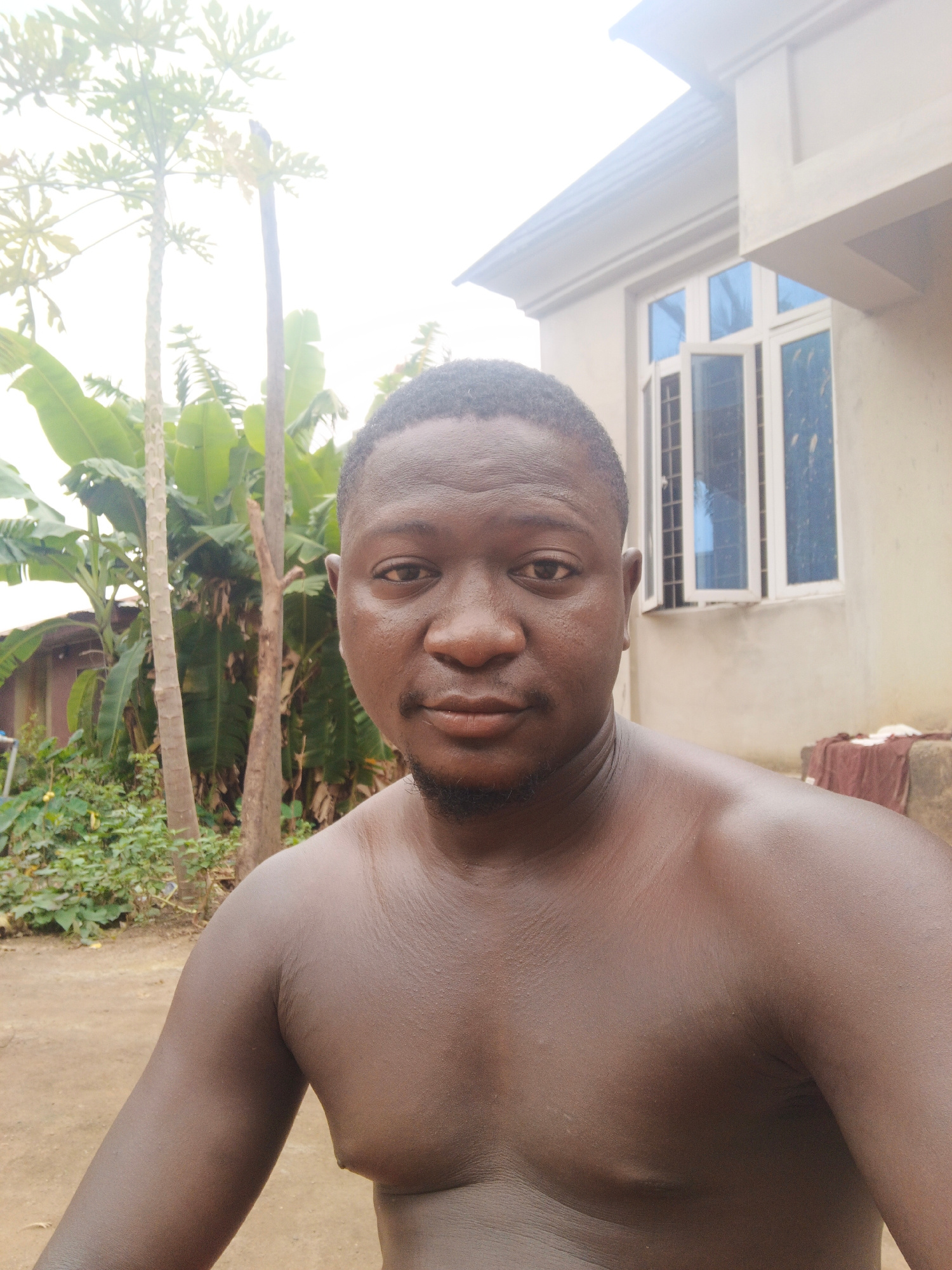 The image depicts a shirtless man with dark skin, facing the camera. He has short, dark hair and a small beard. The background features vegetation, including trees with broad leaves, and a building wi…read more