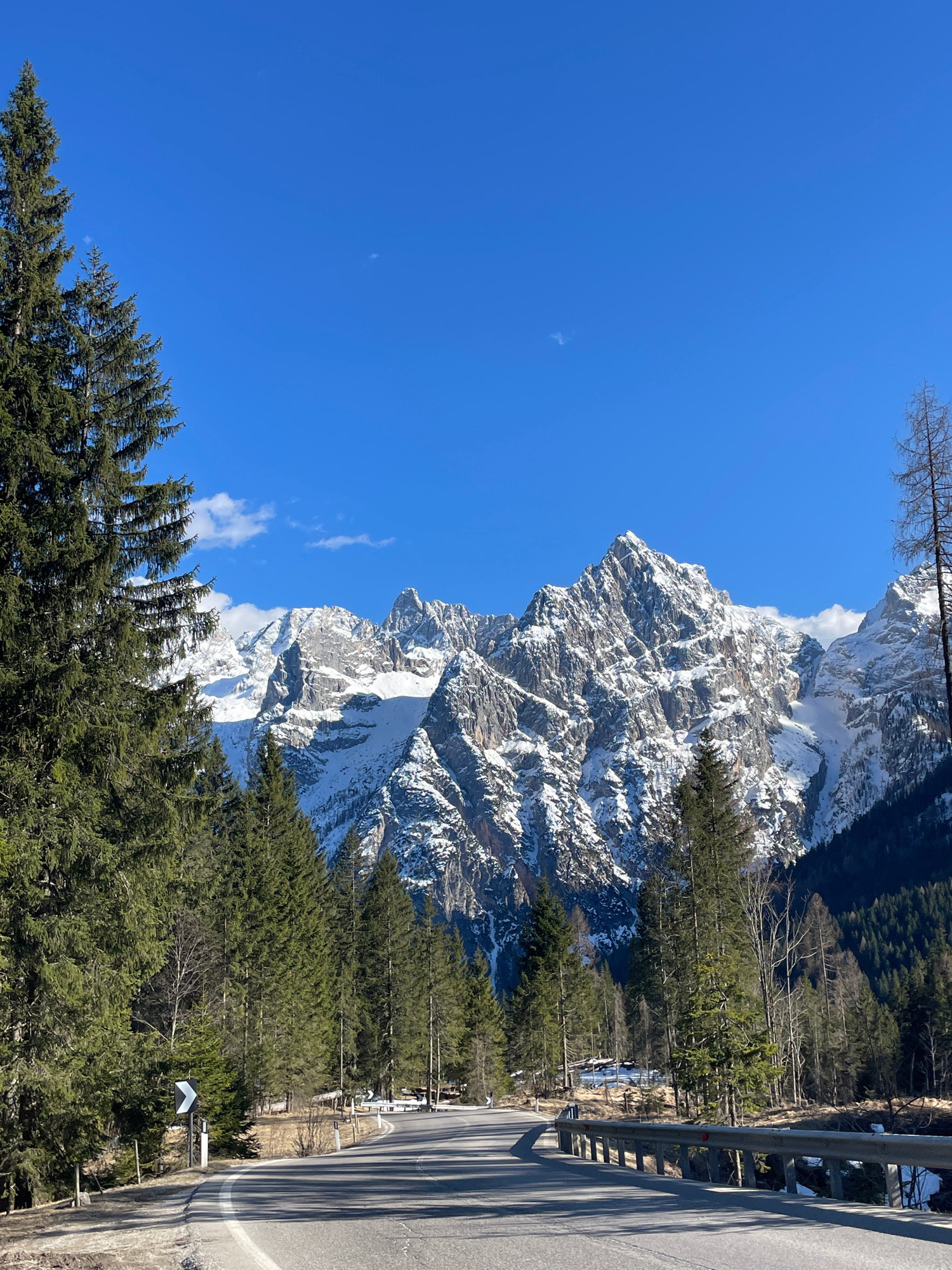 The image shows a view of a snow-capped mountain, likely in the Dolomites, near Auronzo di Cadore, Italy. A highway runs along the right side of the frame, with a metal guardrail separating it from a…read more