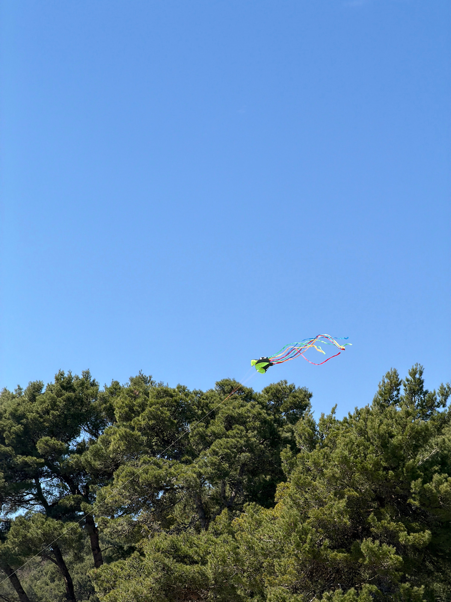 The image depicts a bright blue sky with a kite and a portion of a tree visible. The kite is a vibrant green color with colorful tails extending downwards. The tree is located on the right side of the…read more