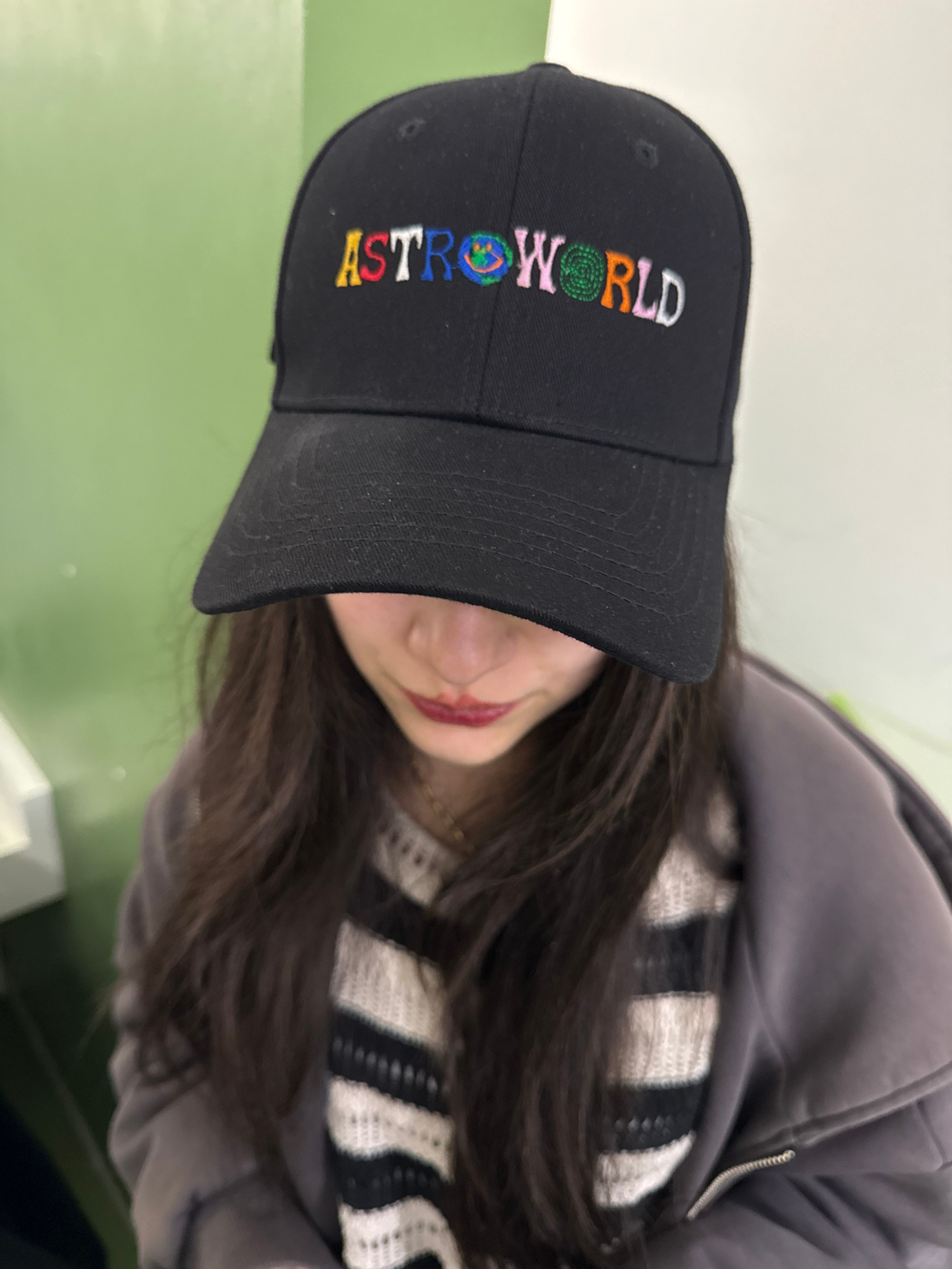 A person is wearing a black baseball cap with "ASTROWORLD" embroidered on it in colorful letters. The person is also wearing a gray zip-up jacket and a black and white striped scarf. The background is…read more