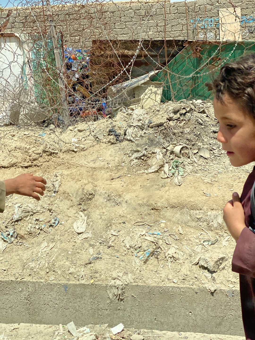 A child's profile is visible on the right side of the image. To the left, a hand is extended. The setting appears to be in an urban area, possibly the city of Kandahar, Afghanistan, with a dirt area f…read more