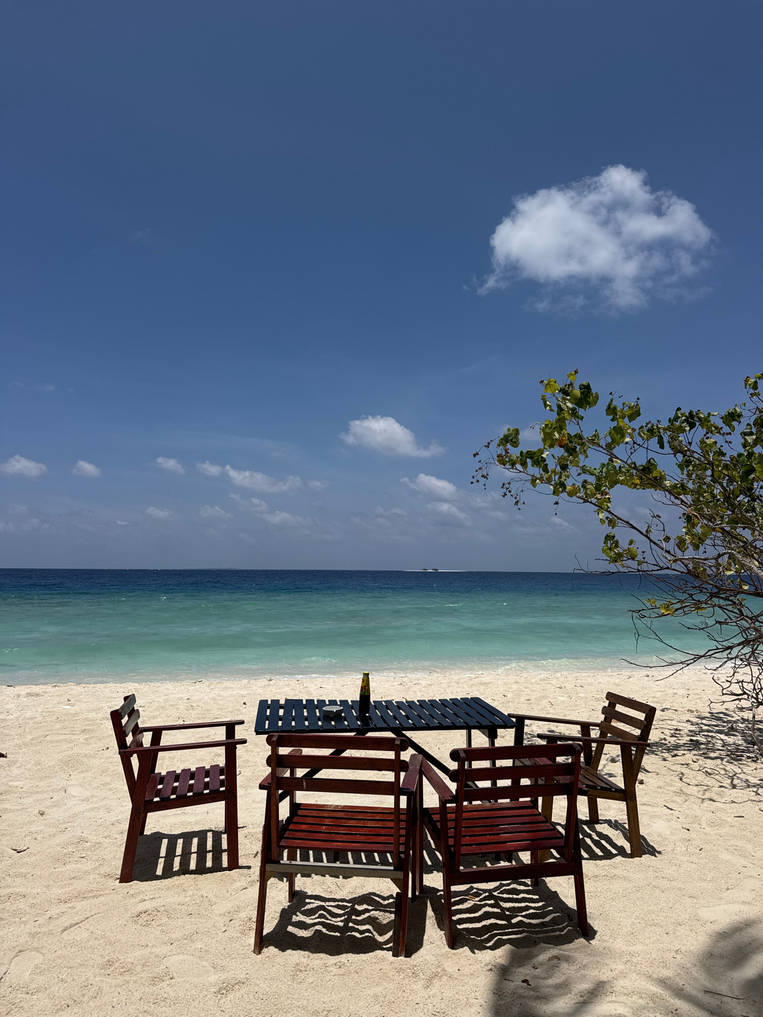 The image depicts a serene beach scene in Ukulhas, Maldives. A set of wooden beach chairs and a small table are arranged on the white sand. The turquoise sea stretches to the horizon under a clear blu…read more