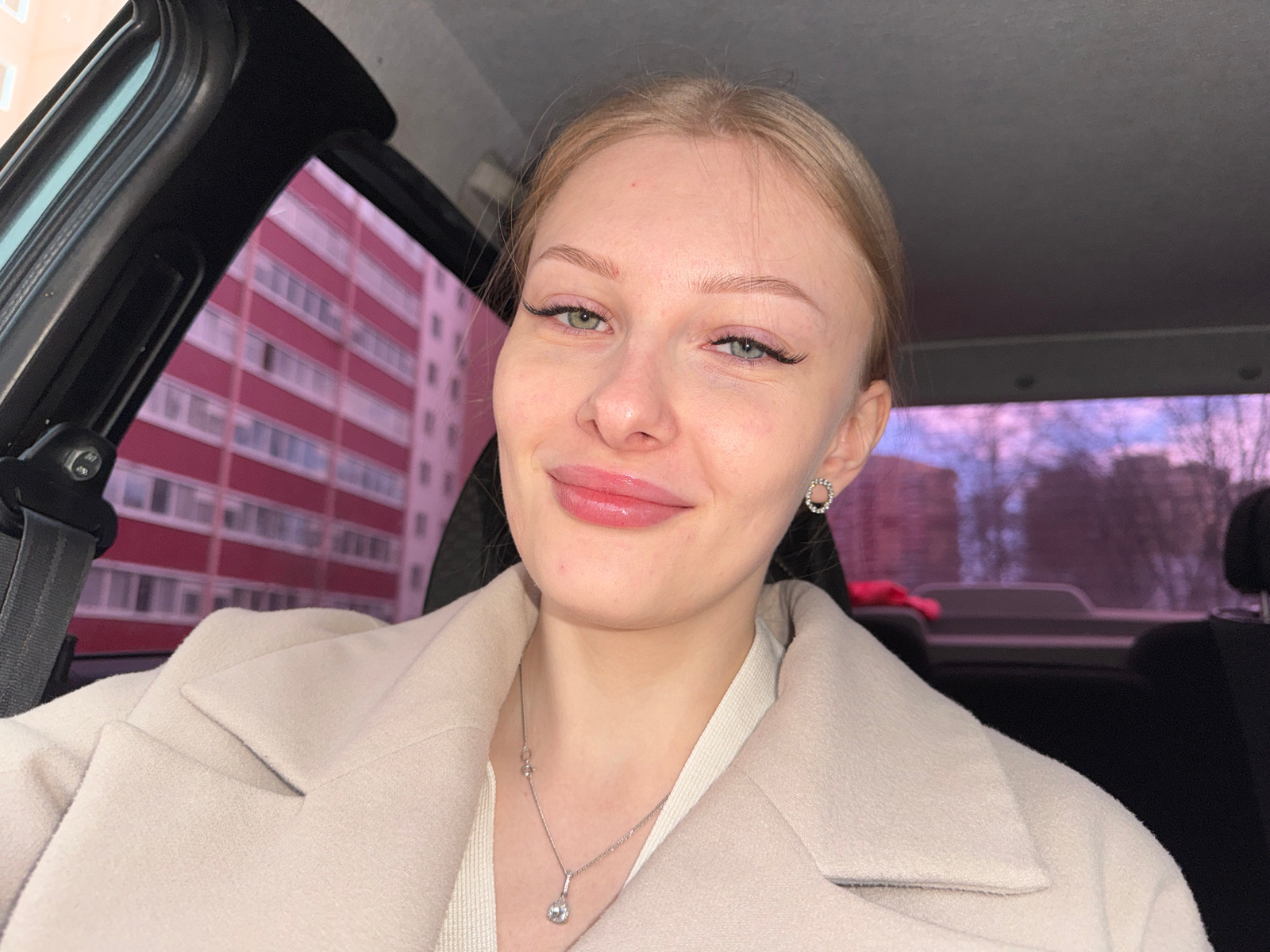 A young woman is in a car, wearing a light-colored blazer and a delicate silver necklace. Outside the car window is a tall apartment building with horizontal red and white stripes. The image was takenβ¦read more