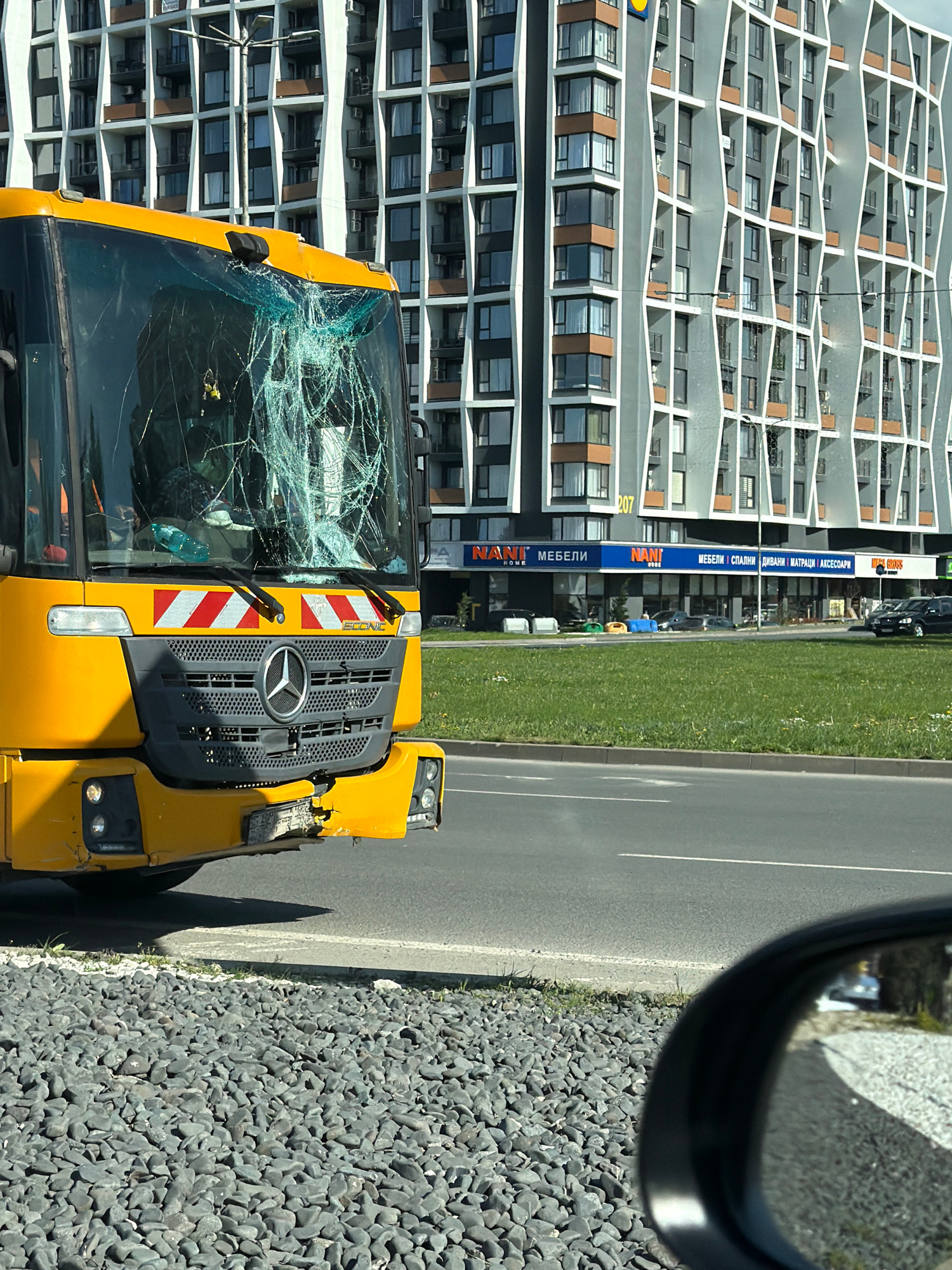 The image shows a yellow Mercedes-Benz Econic garbage truck with a severely cracked windshield parked on the side of a road in Burgas, Bulgaria. The truck is positioned next to a large building with a…read more