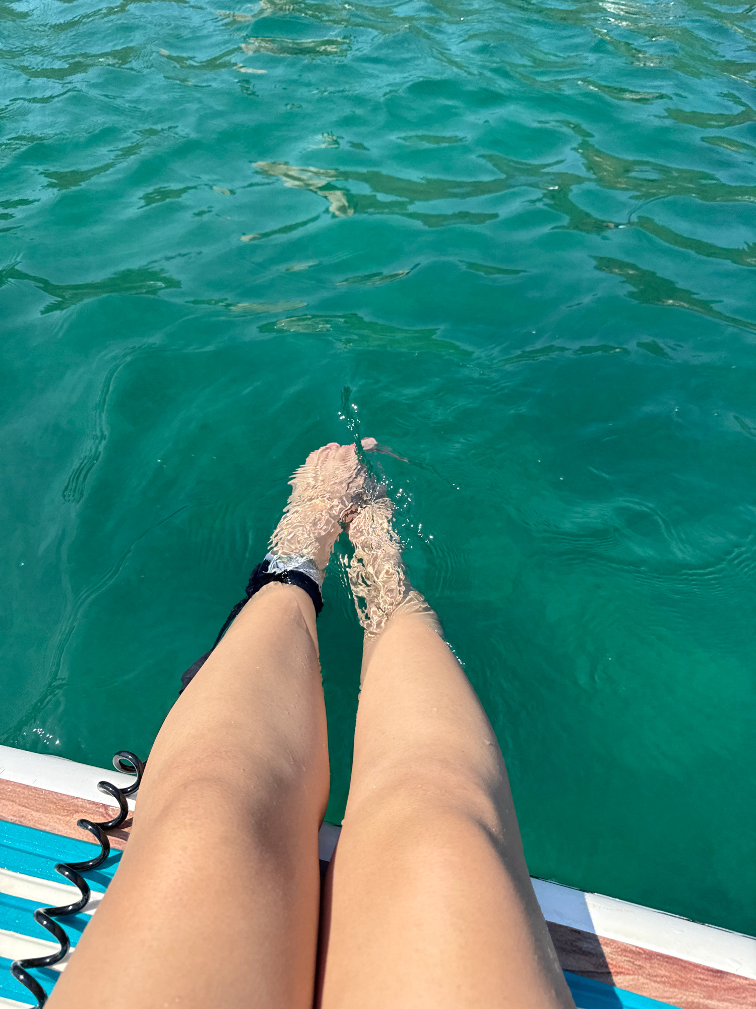 The image shows a person's legs dangling over the edge of what appears to be a paddleboard or similar floating platform, with their feet submerged in clear, turquoise water. The water is calm, with li…read more
