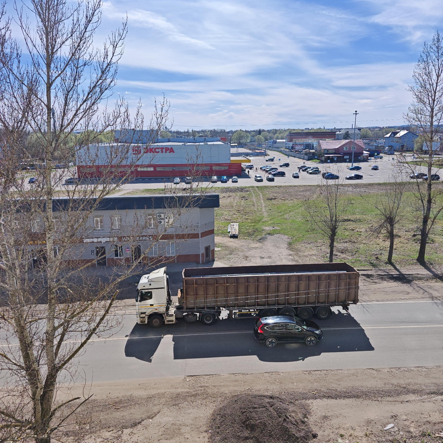 This elevated view captures a bustling commercial and light industrial area in Rostov, Russia, under a bright, partly cloudy sky. The scene depicts a typical daytime setting, likely late morning or ea…read more
