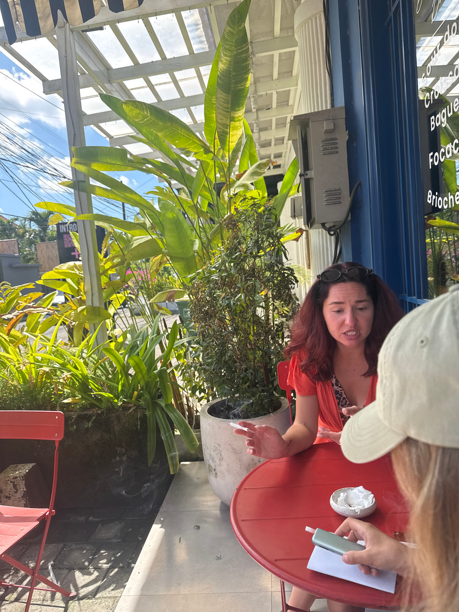 An outdoor scene captures two individuals at a red metal cafe table under bright daylight. The image is taken from a slightly elevated perspective, looking down, and appears rotated. A woman with red…read more