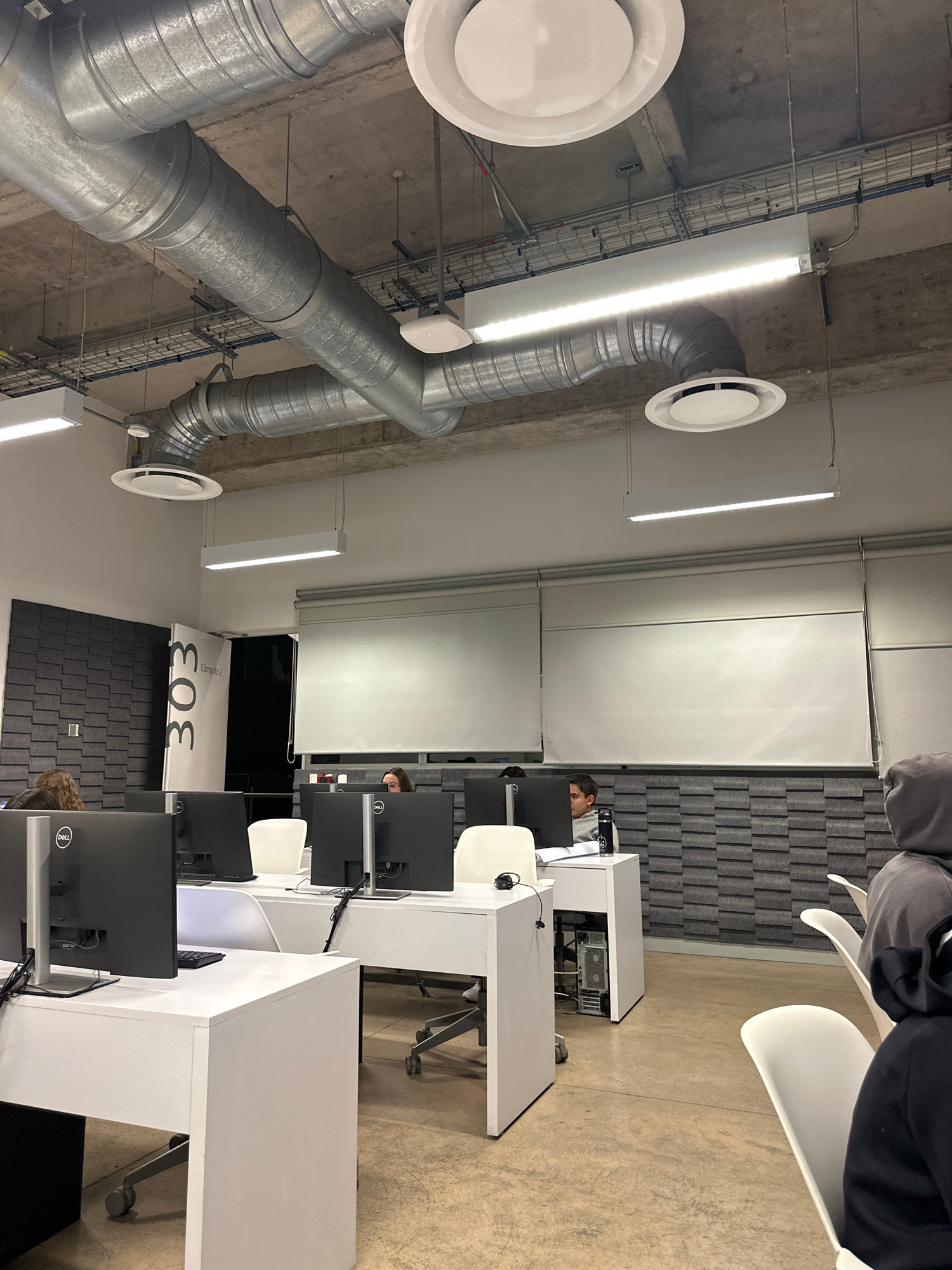 The image depicts an interior room, possibly an office or lab, with multiple computer workstations. The room number "303" is visible on one of the partitions. A person is seated at one of the workstat…read more