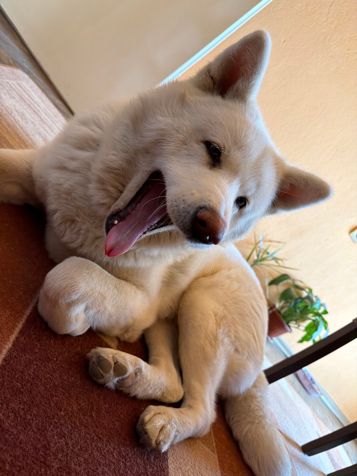 A light-colored dog is lying on a brown, patterned rug indoors. The dog has an open mouth, revealing a pink tongue. The environment includes a plant in a brown pot, located behind the dog. A portion o…read more