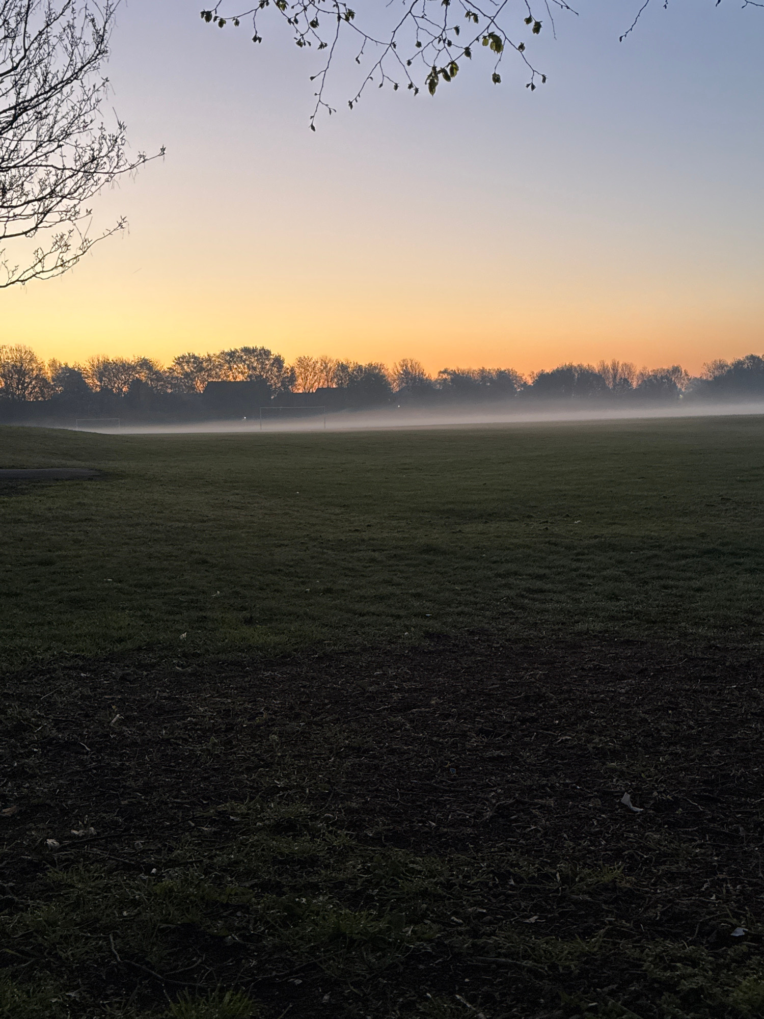The image shows a field of grass in London, United Kingdom, at sunrise or sunset. The grass is dark and slightly damp. In the distance, a line of trees is silhouetted against a yellow sky, with a laye…read more