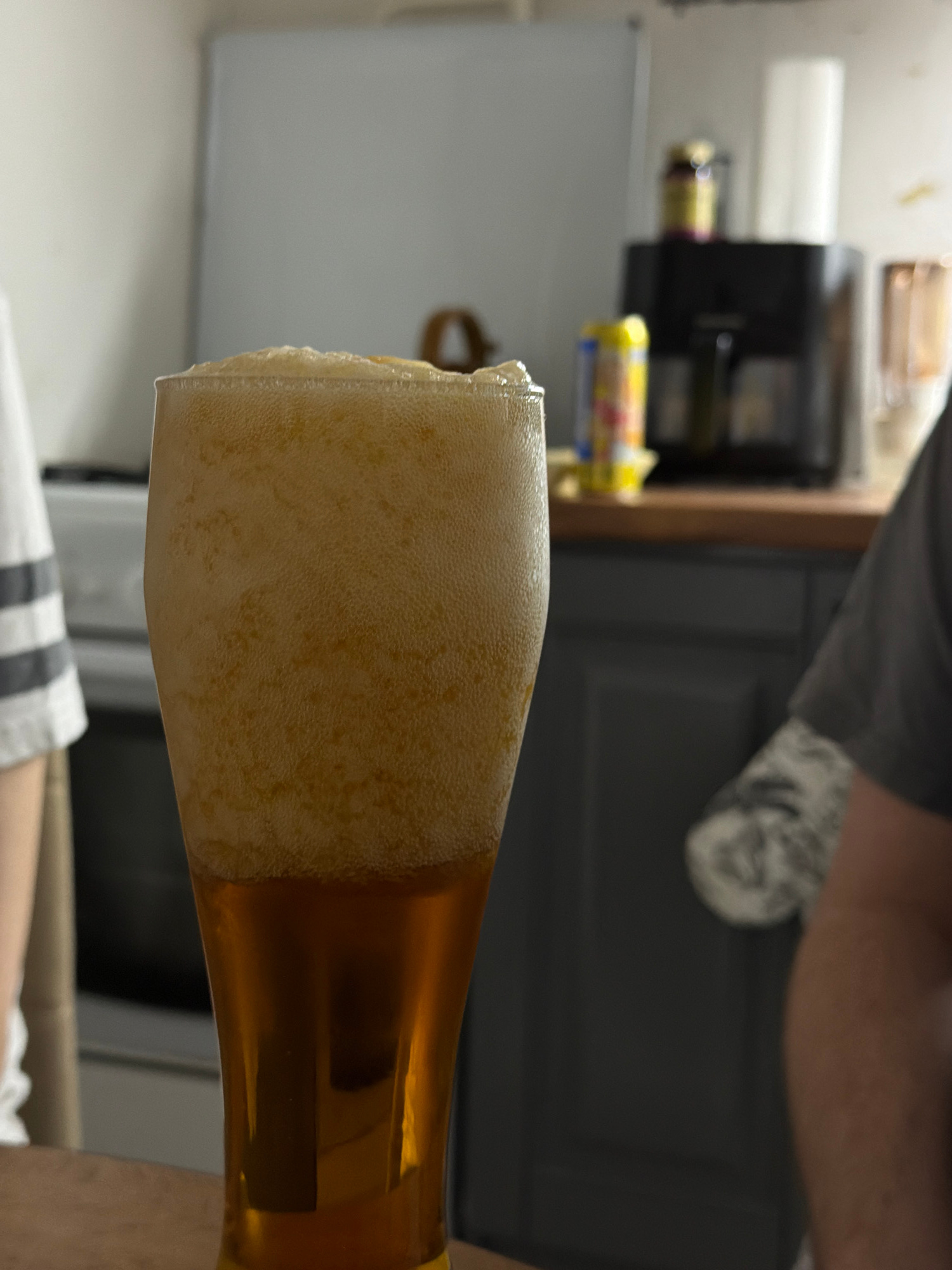 A tilted close-up shot shows a partially-full glass of beer with a large foamy head. The beer is golden in color. A blurry background includes kitchen cabinets, a refrigerator, and various objects on…read more