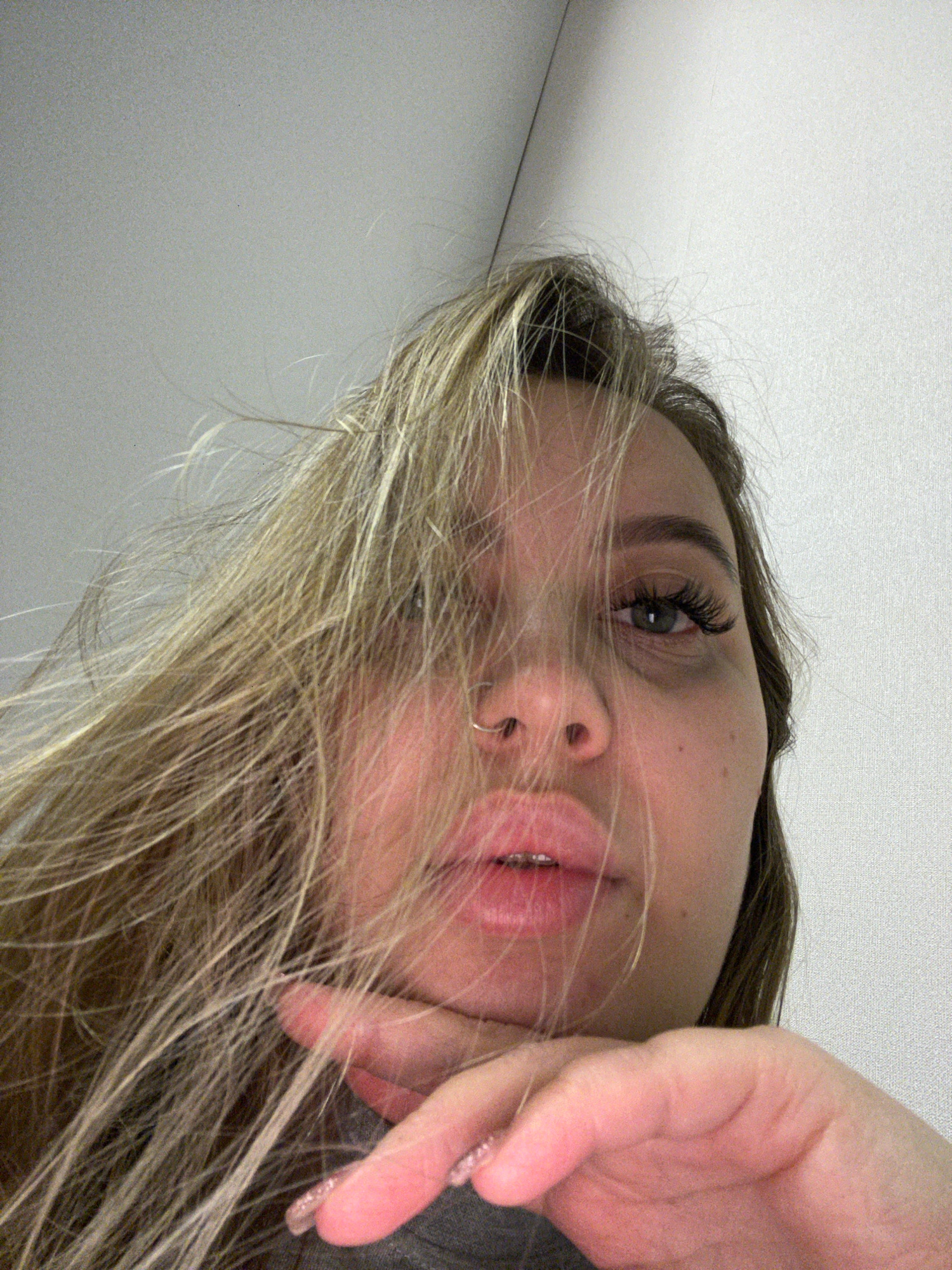 A selfie taken from a low angle shows a person with long, blonde hair partially obscuring their face. The person has a nose ring and appears to be wearing eyelash extensions. Their hand is raised near…read more