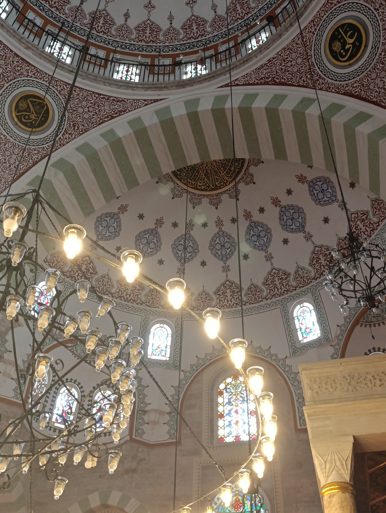 The image depicts the interior of a mosque, potentially located in Üsküdar, Turkey, due to the architectural style. The focal point is the ornate ceiling, adorned with intricate patterns, calligraphy,…read more
