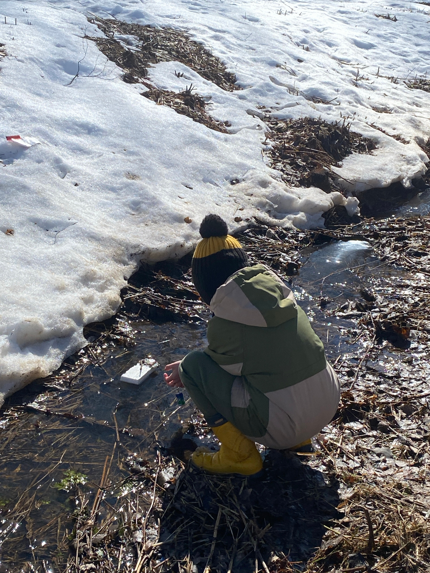 A person wearing a green and tan jacket, yellow boots, and a black and yellow hat is crouched next to a stream or puddle. The environment is a mix of snow and dry vegetation. The person's hand is near…read more