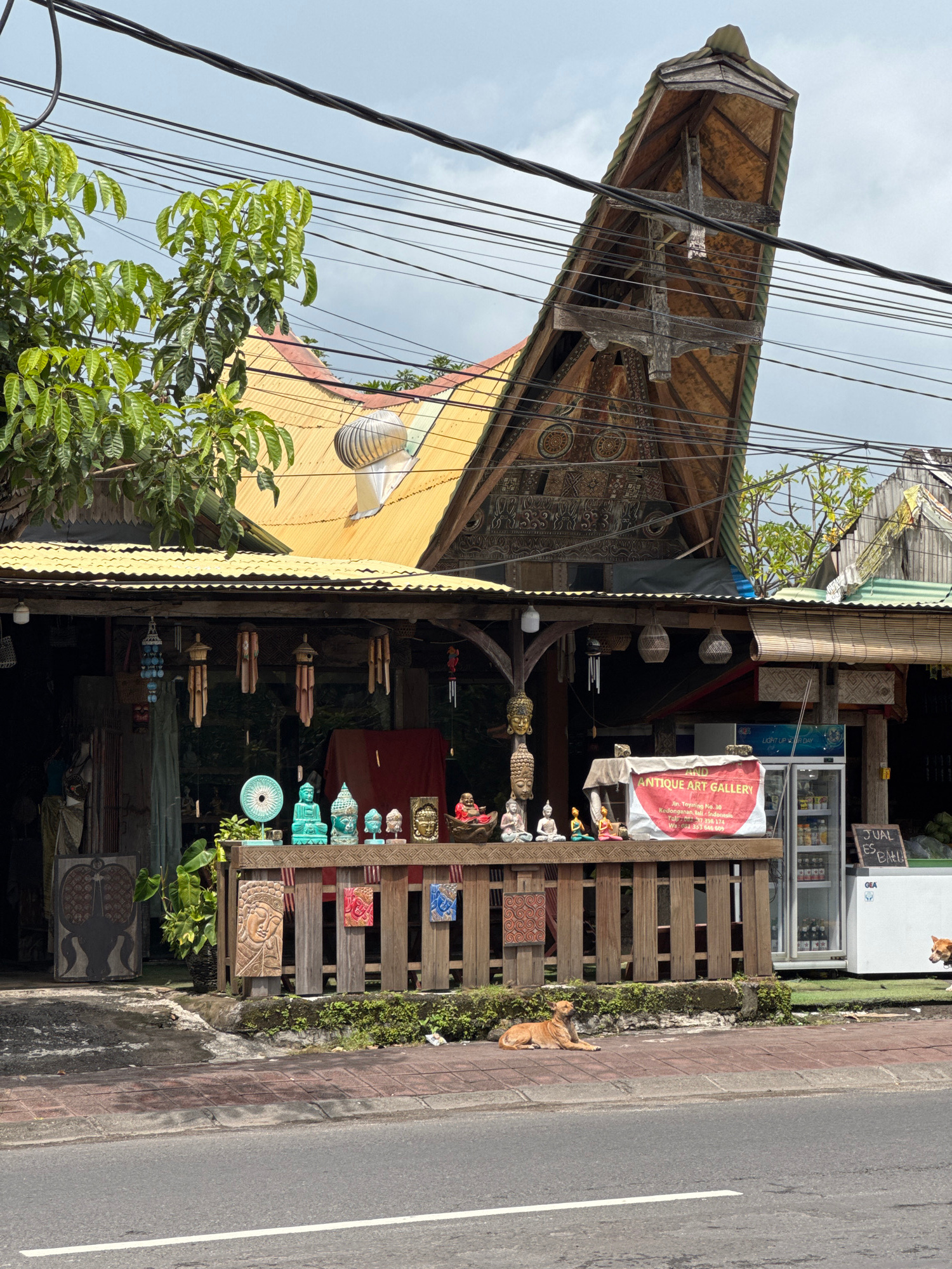 This media file captures a vibrant street scene in Kuta, Indonesia, depicting a shop or art gallery alongside a road under an overcast sky. The primary subject is a building on the left, identified a…read more