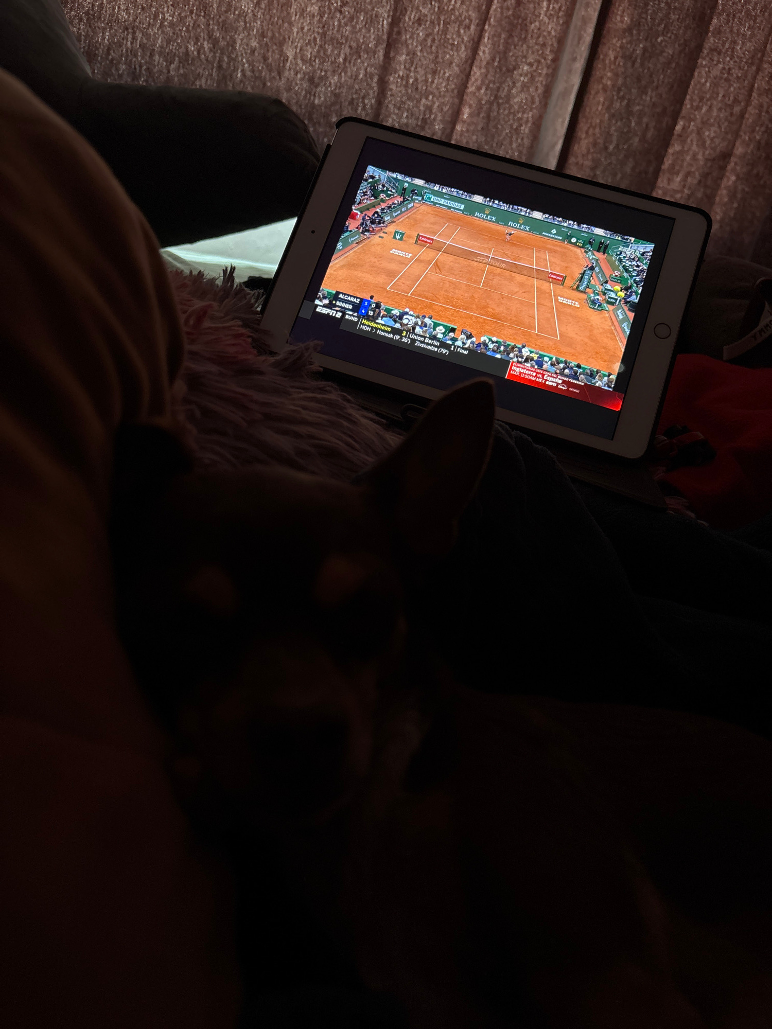 A person is watching a tennis match on an iPad. The screen shows a clay court with players on opposite sides of the net. A score graphic on the screen indicates the match is between "Alcaraz" and "Sin…read more