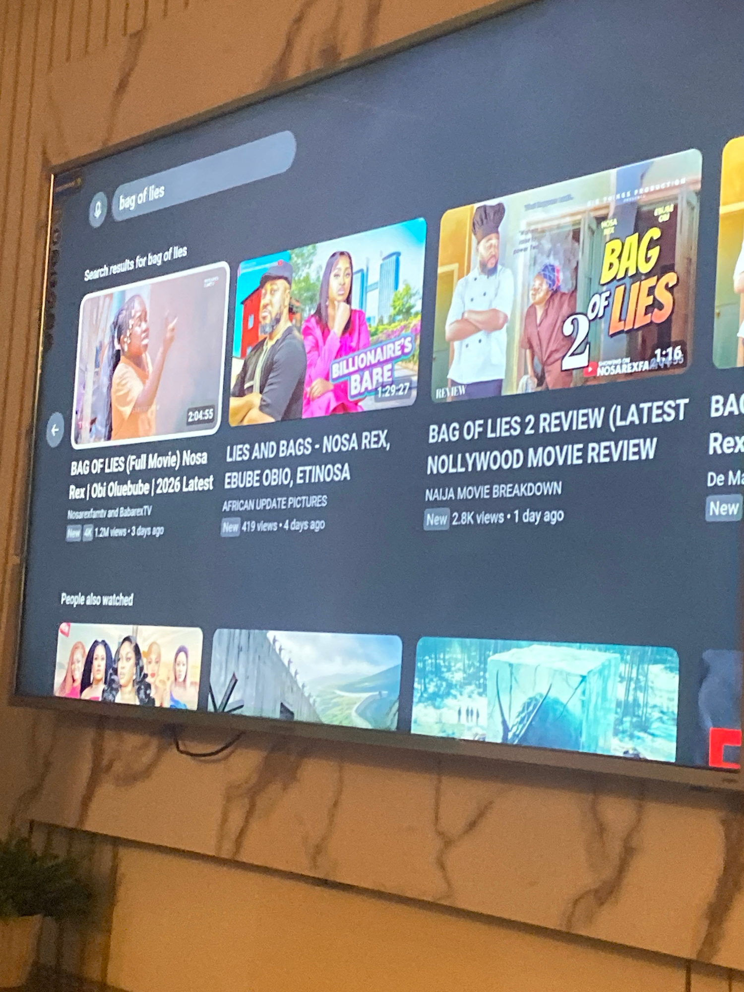 The image shows a television screen displaying search results on YouTube for "bag of lies." The screen displays several movie thumbnails and titles, including "BAG OF LIES (Full Movie) Nosa Rex" and "…read more