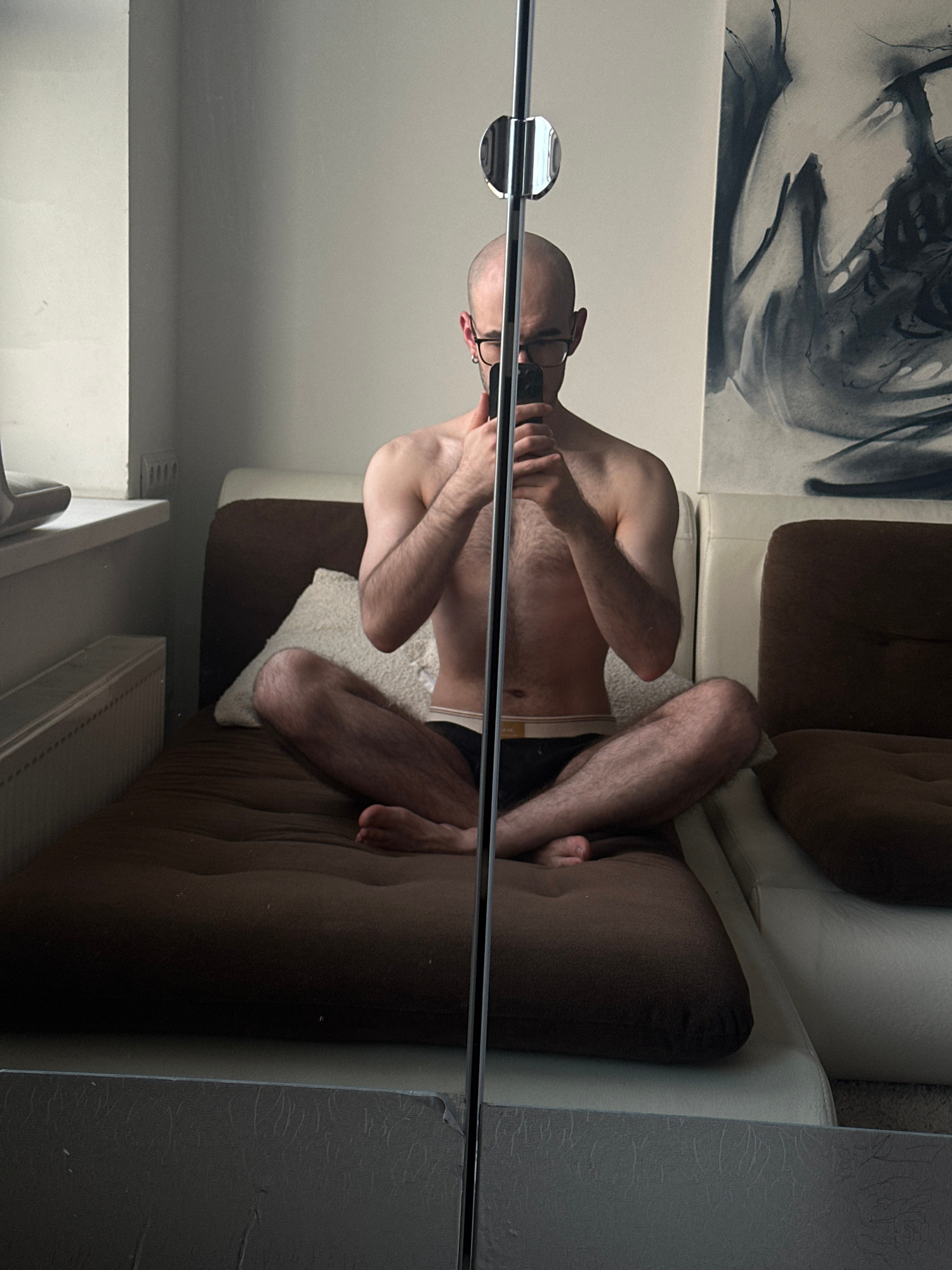 A shirtless man is reflected in a mirror, seated on a couch with brown cushions and a white section. He is holding a device in his hands, possibly taking a photograph or video. The reflection also sho…read more
