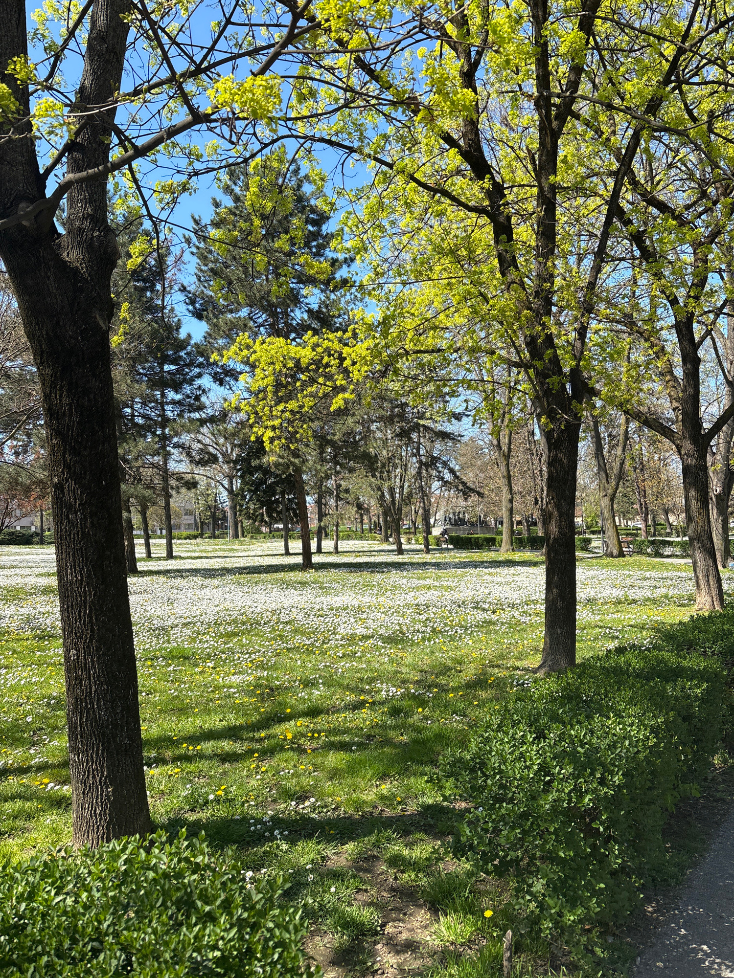 The image depicts a sunny park scene in Kraljevo, Serbia. The ground is covered in a field of grass interspersed with numerous small white flowers. Several mature trees with thick trunks are visible,…read more