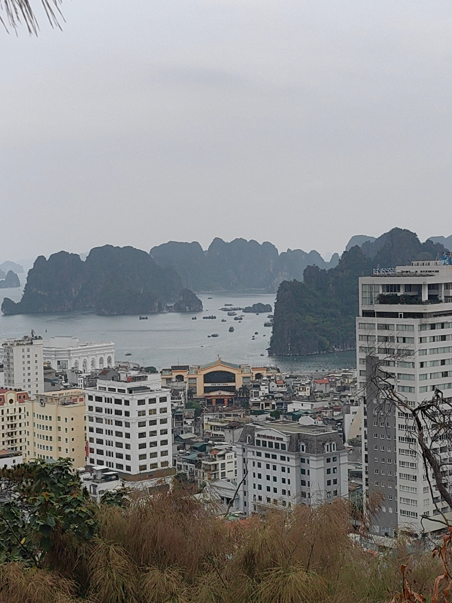 The image presents an expansive elevated view overlooking a coastal city and bay, characterized by dramatic limestone karst formations in the distance under a uniformly overcast, light grey sky. The s…read more