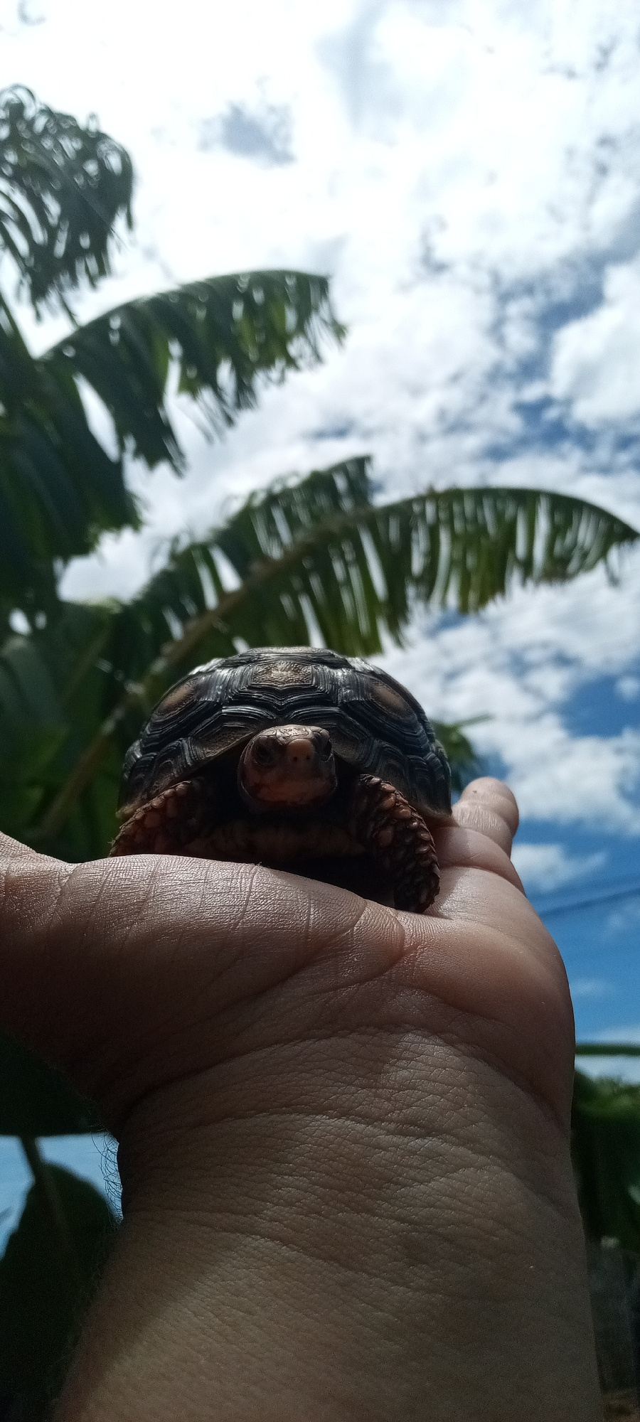 A hand holds a small turtle under a cloudy sky with palm trees in the background. The city is unknown.