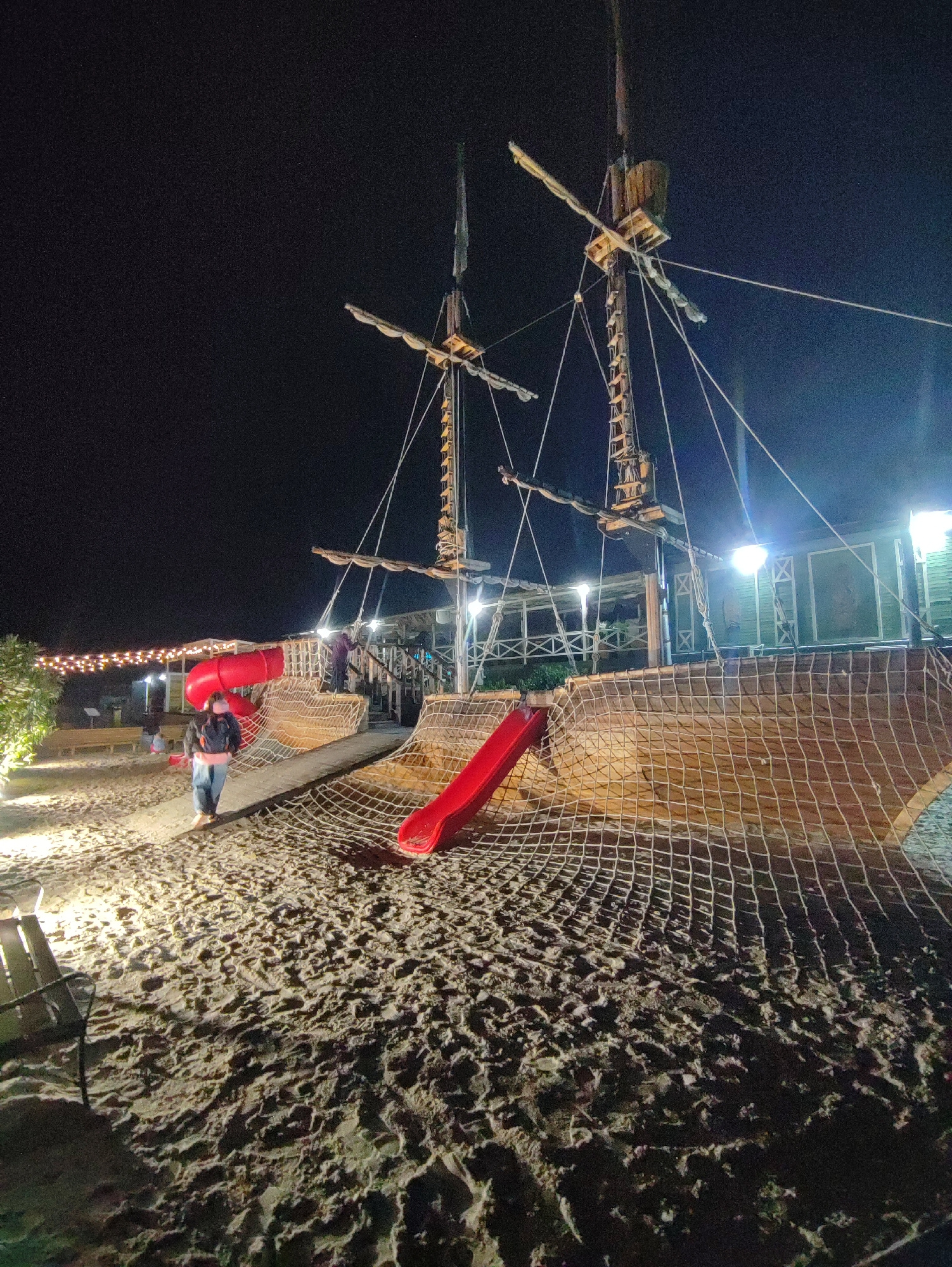 The image shows a nighttime scene with a large, wooden pirate ship playground structure in what appears to be a recreational area in Sirius, Russia. The ship has two masts and rope netting around its…read more