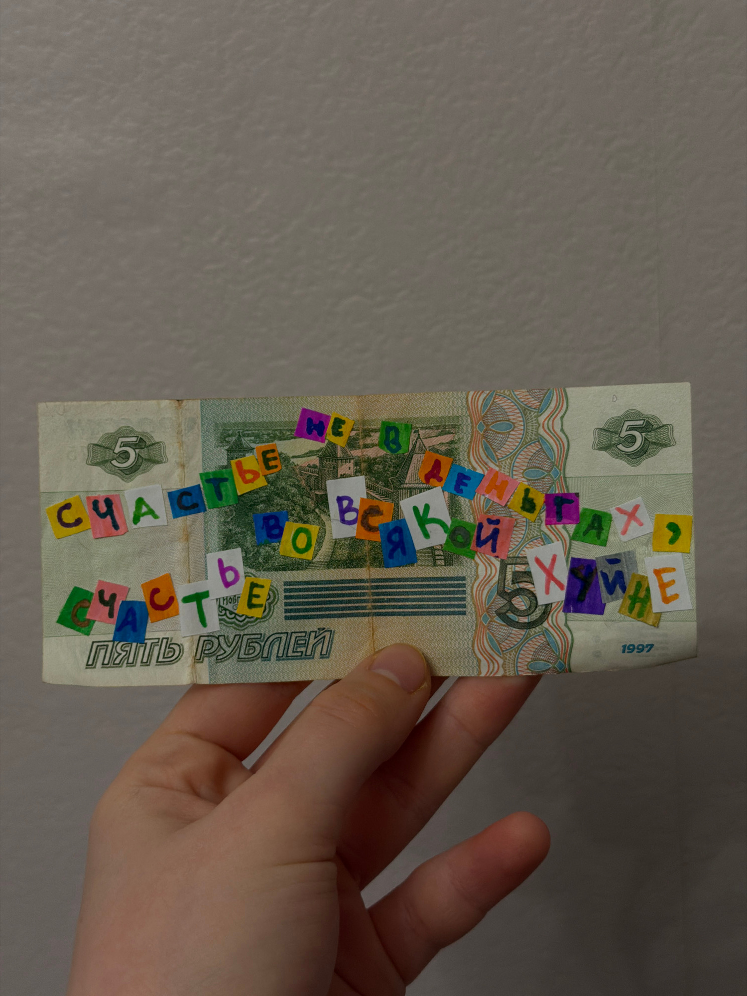A hand holds a 5-ruble banknote. The banknote is decorated with multicolored letters spelling out a phrase in Russian: "He Be Without Sorrow And Happiness". The banknote features the city of Veliky No…read more