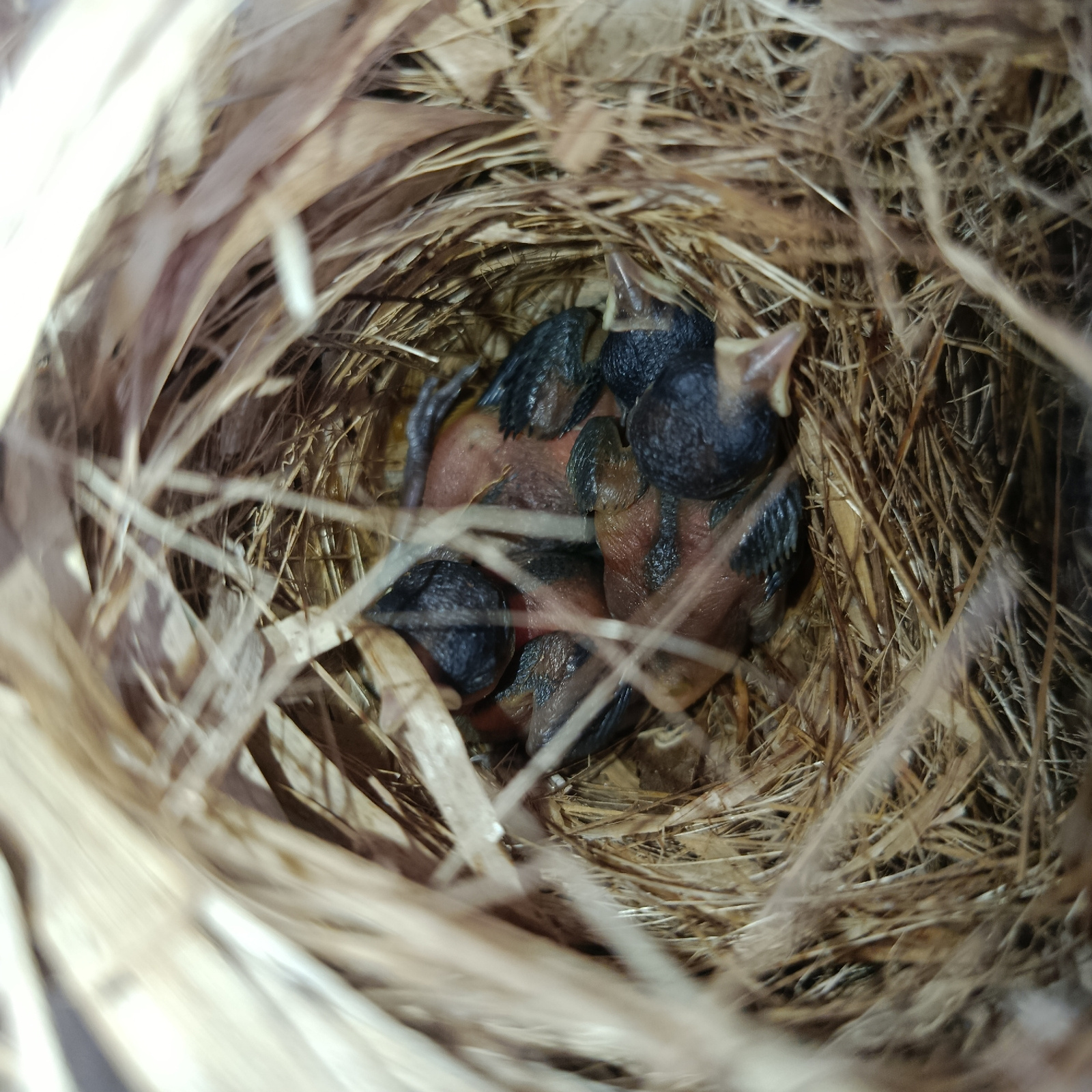 A bird's nest, constructed from dried grass and leaves, contains several baby birds with dark feathers and pink skin. The nest is located somewhere in the city of Los Velásquez, Venezuela. The baby bi…read more