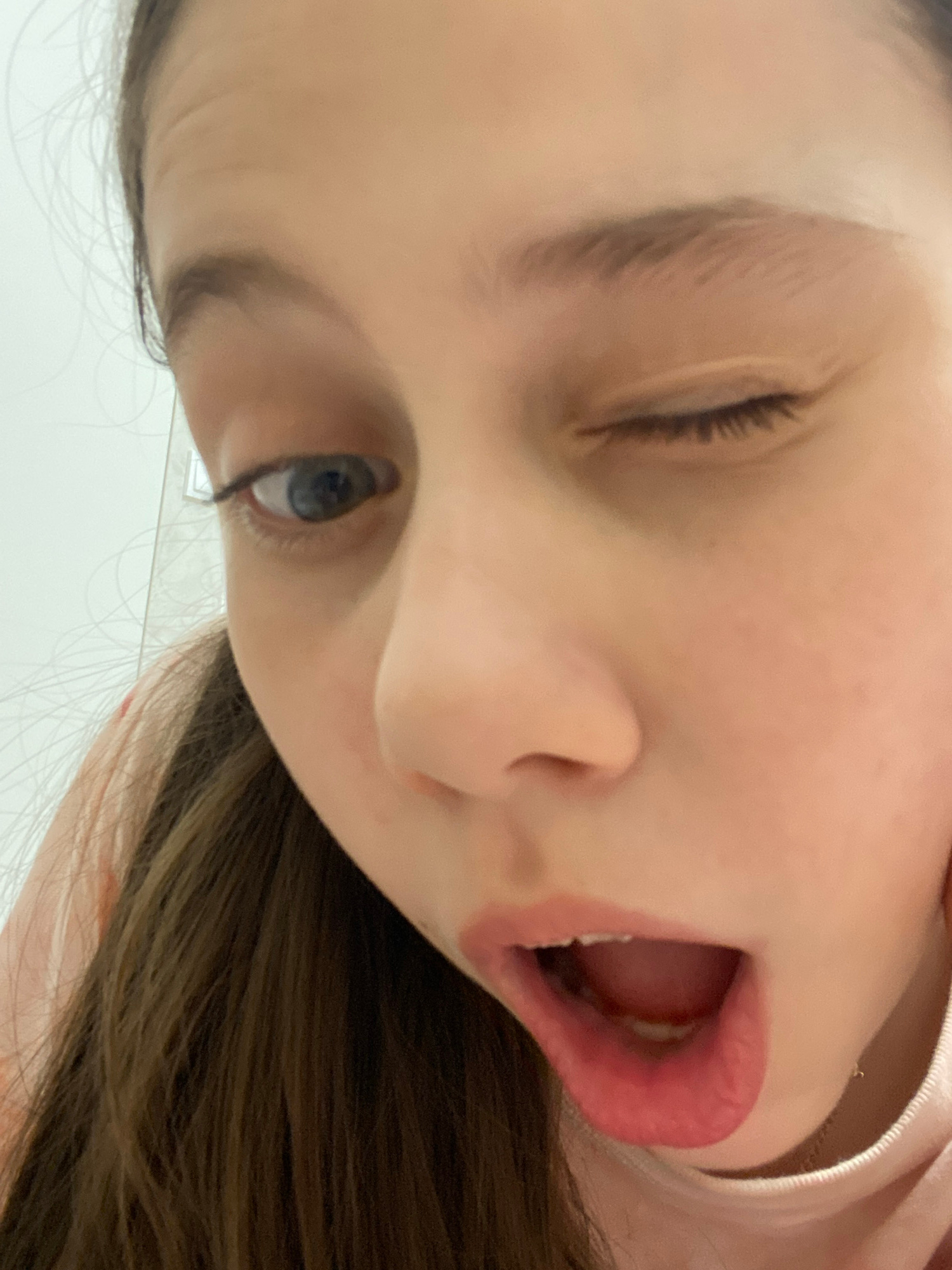 Close-up, angled view of a person's face. One eye is open, displaying a blue iris. The other eye is closed. The mouth is open. The person has brown hair. The background appears to be a white surface.…read more