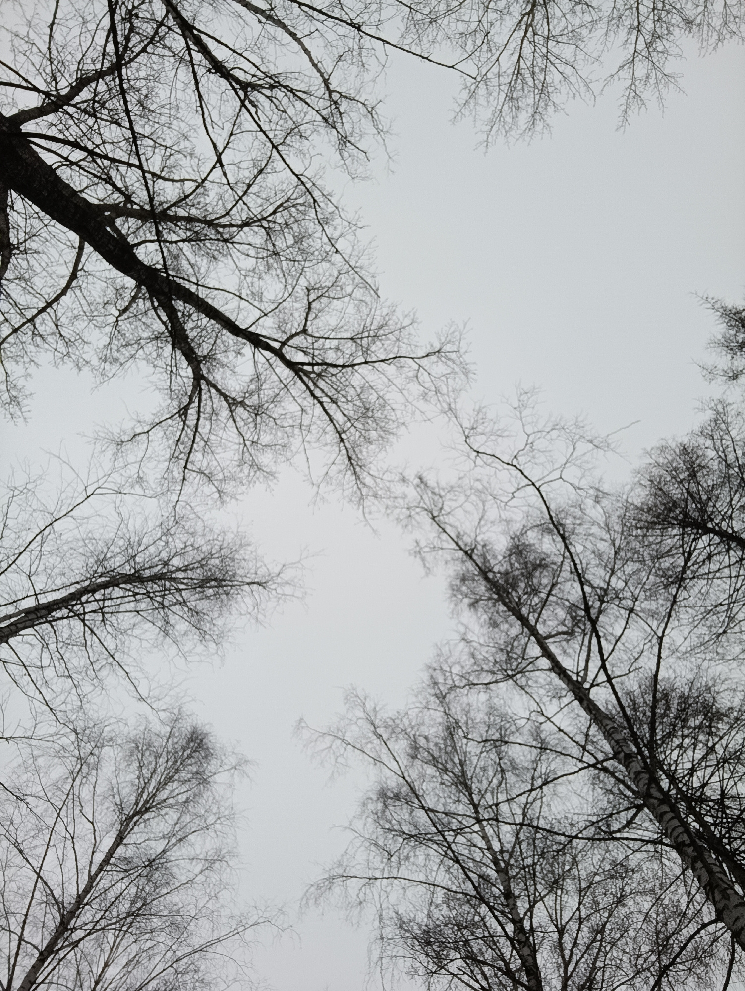 The image is a monochrome, low-angle shot looking up at several bare trees against a light gray sky. The trees are leafless, with intricate patterns of branches and twigs silhouetted against the sky.…read more