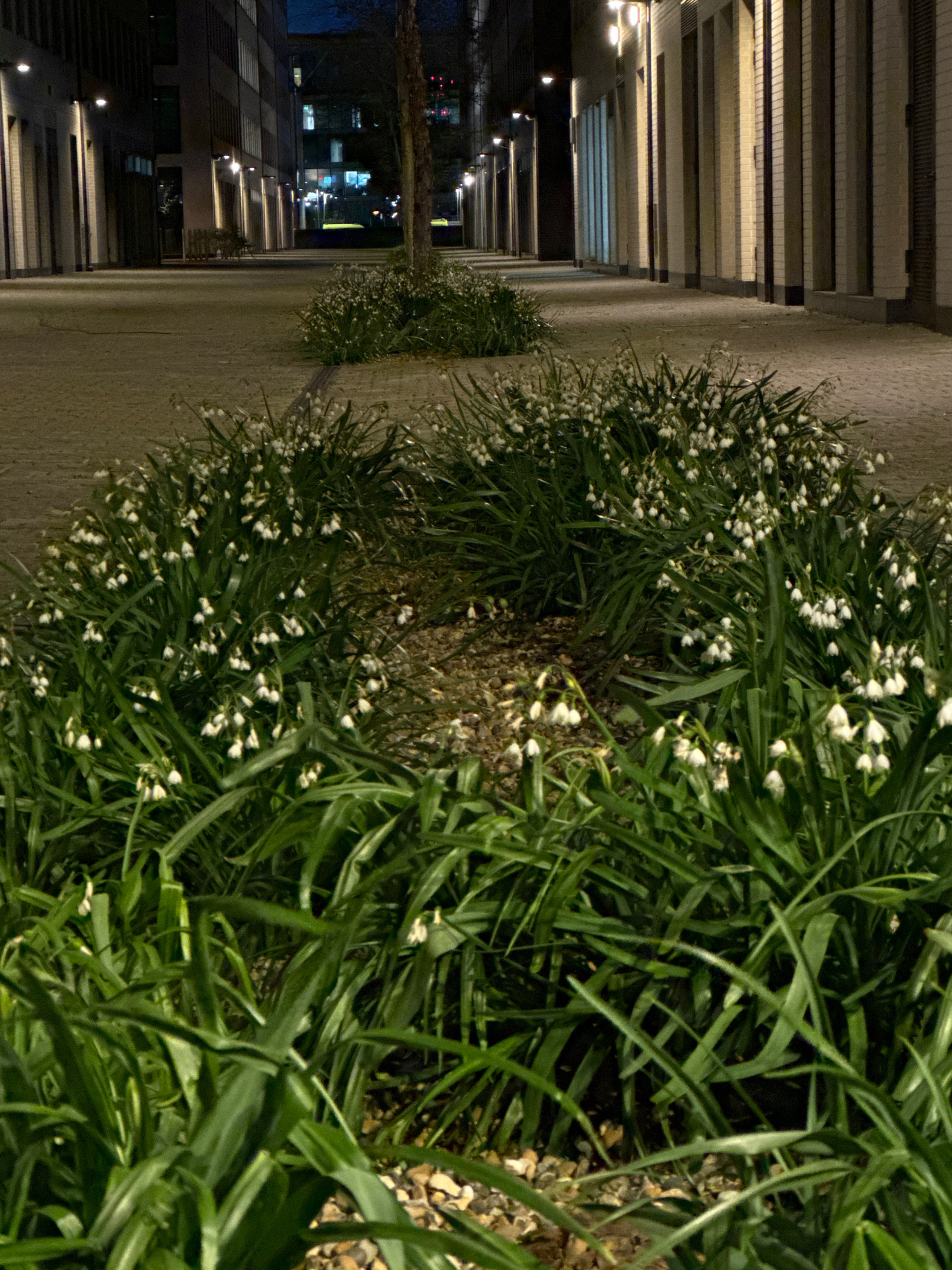 The image captures a night scene in London, United Kingdom, likely in a pedestrian area adjacent to modern architecture. The dominant features are the rows of green plants with small white flowers lin…read more