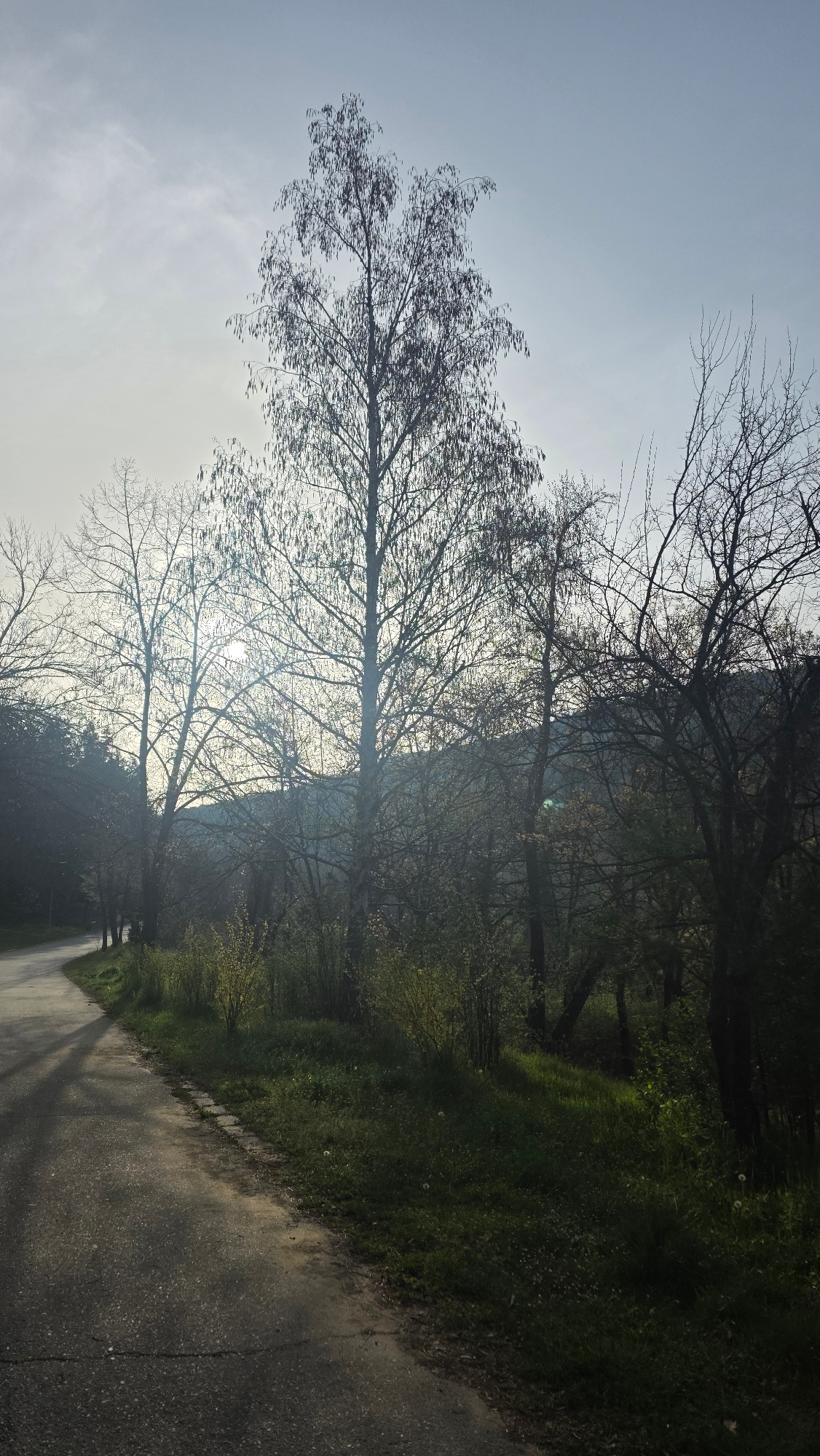 The image shows a path in a park, bordered by greenery on one side and trees on both. The sun is visible through the branches of the trees. The location is likely a park in Blagoevgrad, Bulgaria, give…read more