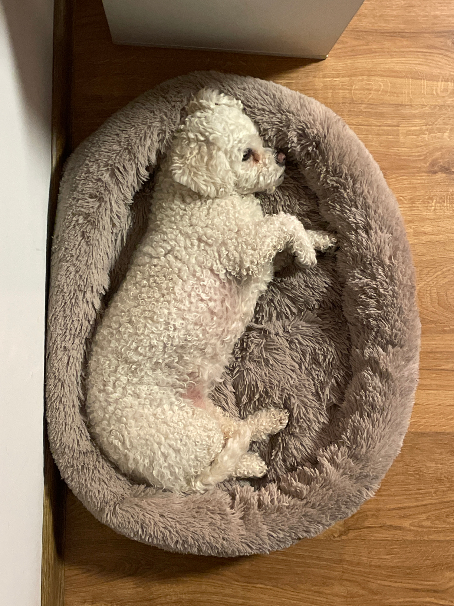 A small, white, curly-haired dog is lying on its back in a round, gray, fuzzy pet bed. The bed is placed against a light brown wood-paneled wall and a white surface. The dog's paws are curled upwards,…read more