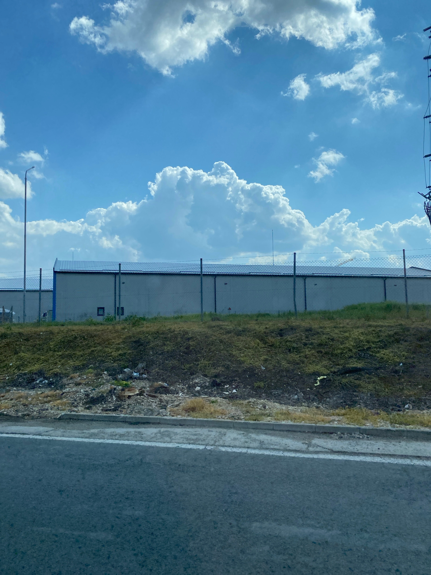 The image shows a view of the sky, a building, a fence, a roadside, and a road. The sky is blue with puffy white clouds. A long, rectangular building with a flat roof runs horizontally across the imag…read more