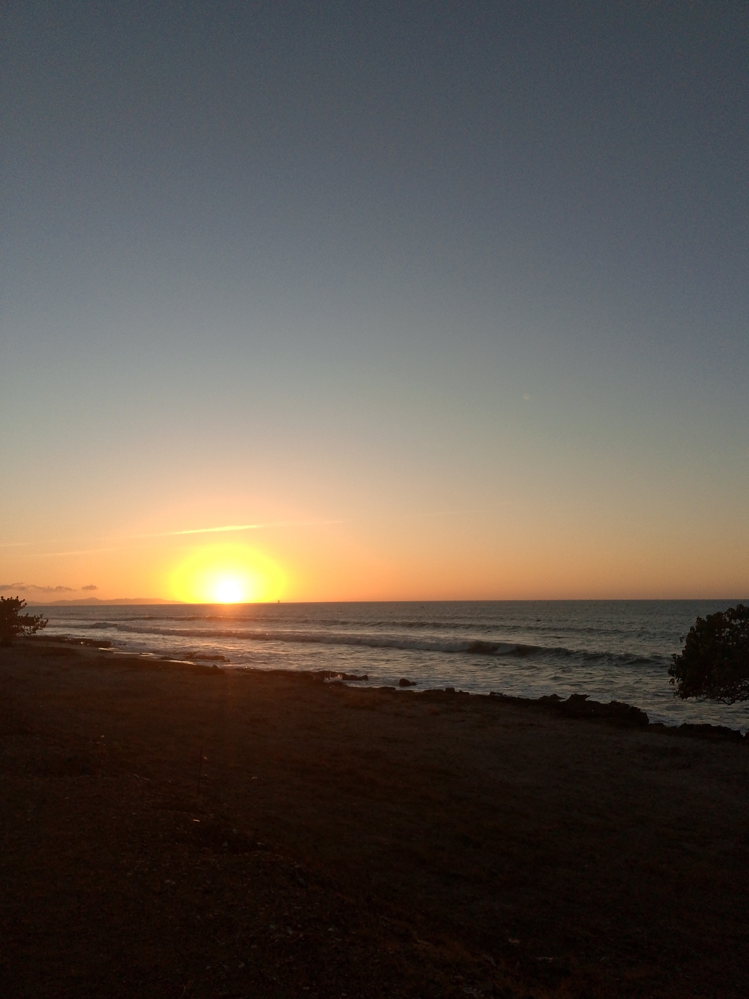 This image depicts a sunset over the ocean at Juan Griego, Venezuela. The sun is low on the horizon, casting a bright orange glow across the sky and water. The beach is dark in the foreground, and som…read more