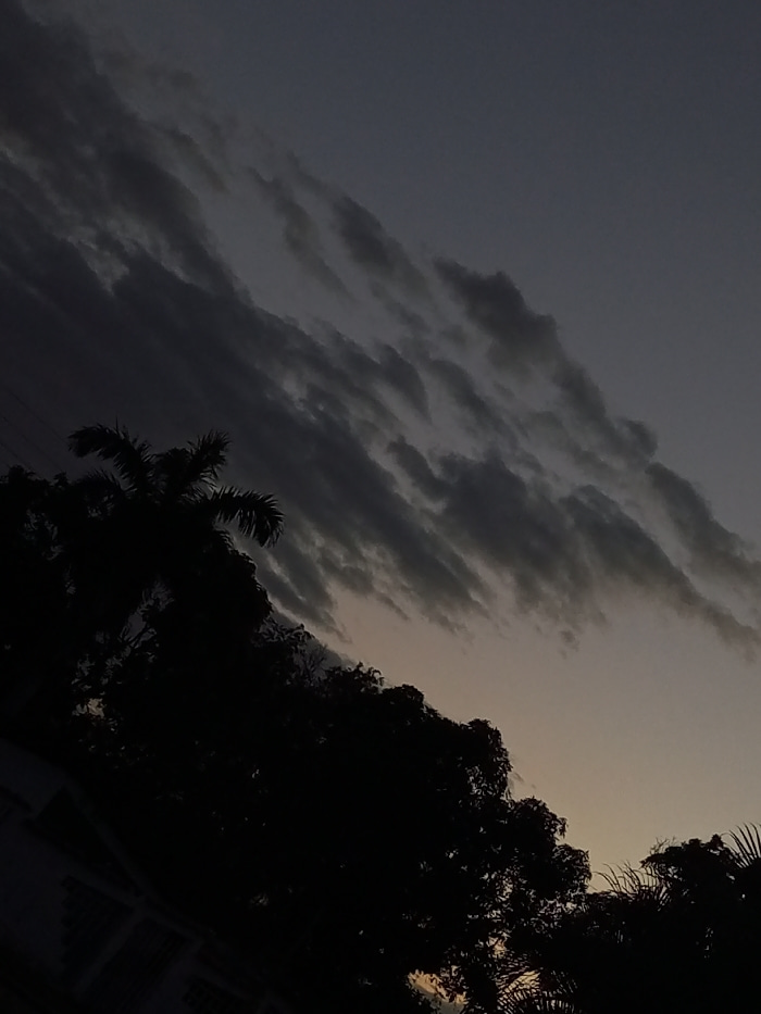 A dusky sky filled with long, striated clouds dominates the image, shifting from a pale orange near the horizon to a dark blue-gray above. Silhouetted trees, including a palm, occupy the lower portion…read more