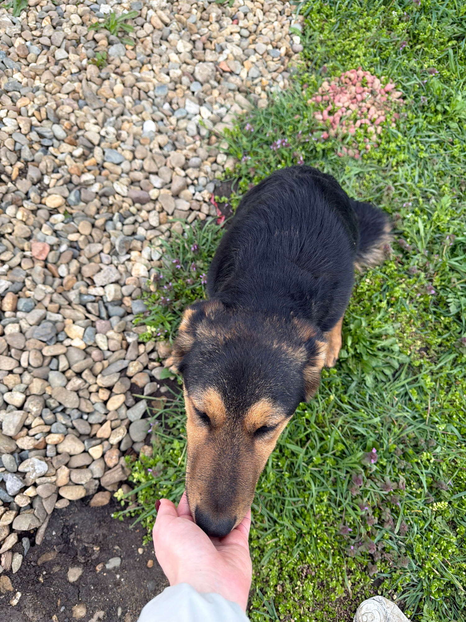 A black and tan dog is lying on a patch of grass and stones in Rossiyskiy, Russia. A hand is reaching out to pet the dog. The ground is covered in grass, small pink flowers, and small grey-brown stoneβ¦read more