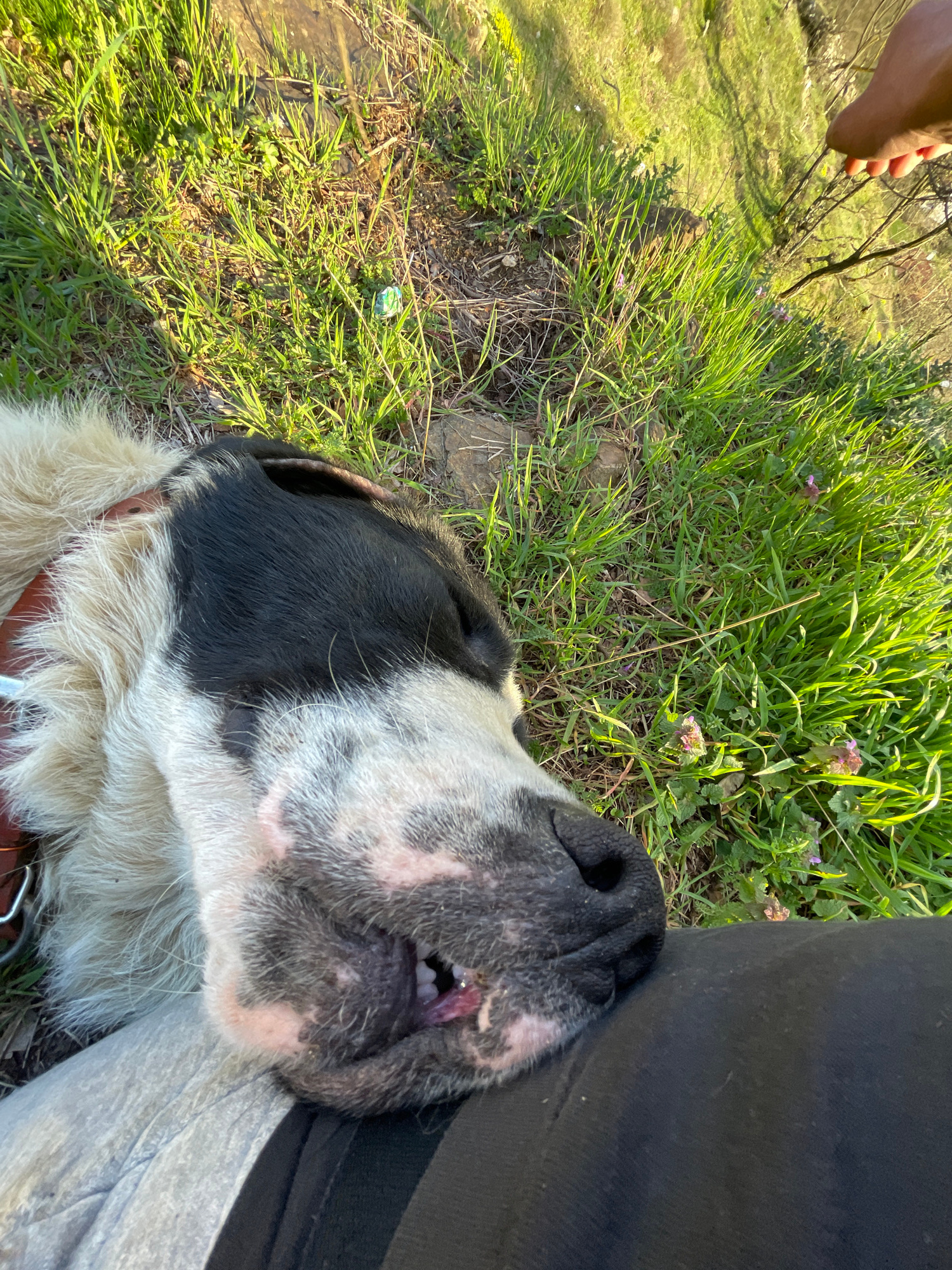 A dog with black and white fur is lying on the grass, resting its head against a person wearing gray pants and a black shirt. The dog's tongue is slightly visible. Green grass and some small purple fl…read more