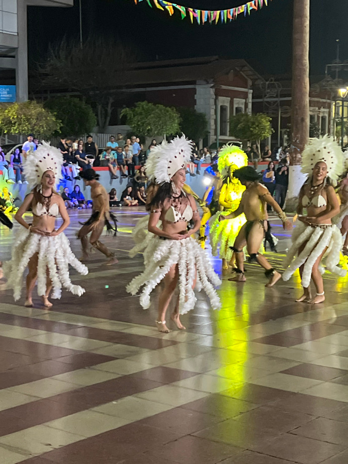 The image depicts an outdoor cultural performance at night in a public square in Arica, Chile, likely Plaza Colón. In the foreground, at least three female dancers and two male dancers are in various…read more