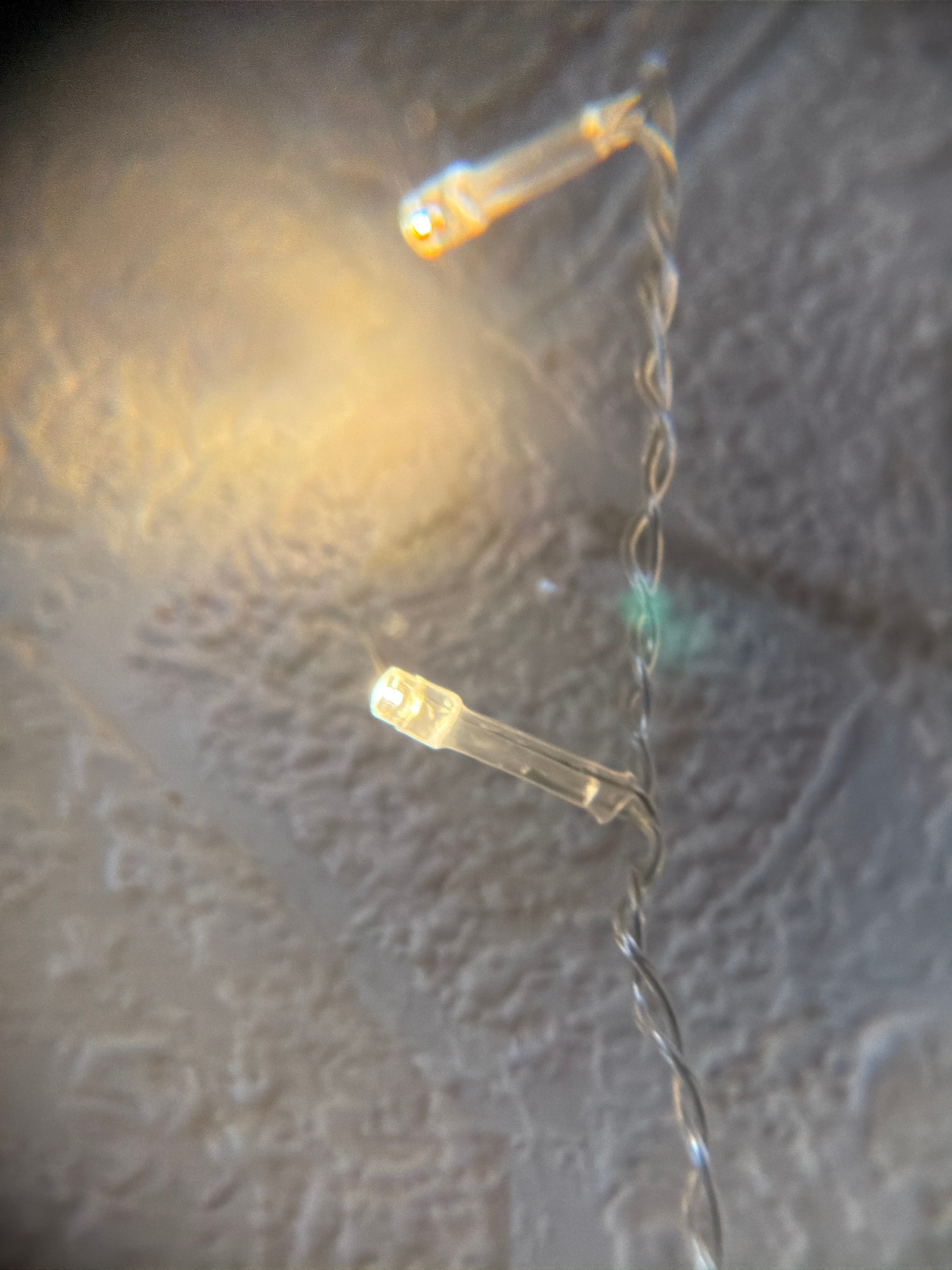 The image shows a close-up of two small, warm-white LED fairy lights connected by a thin, twisted wire. The background is a blurred, textured surface, possibly a wall or fabric, in shades of gray and…read more